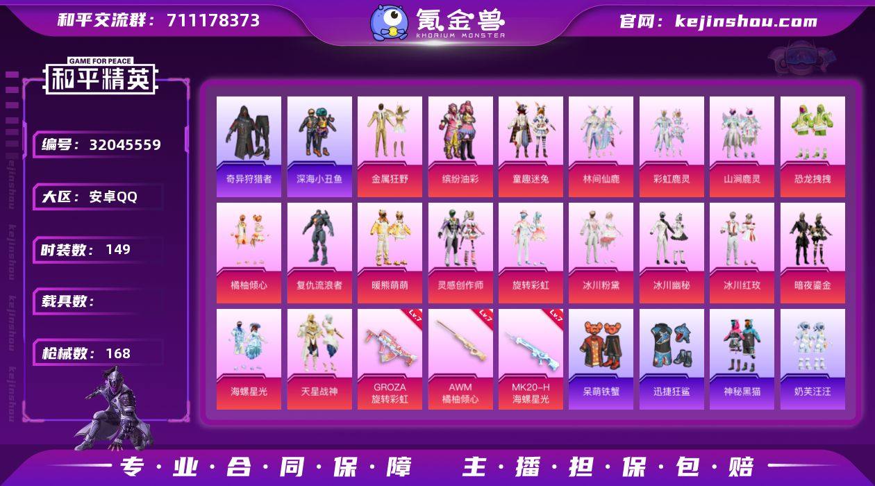 安卓 手Q-18粉装-3特效枪-0载具-63033热力值-4印记-149套装-168枪皮 【特效枪等级】:GROZA-旋转彩虹(七级),AWM-橘柚倾心(七级),MK20-H-海螺星光(七级) 【优质套装】:粉装-金属狂野,粉装-缤纷油彩,粉装-童趣迷兔,粉装-林间仙鹿,粉装-彩虹鹿灵,粉装-山涧鹿灵,粉装-恐龙拽拽,粉装-橘柚倾心,角色-复仇流浪者,粉装-暖熊萌萌,粉装-灵感创作师,粉装-旋转彩虹,粉装-冰川粉黛,粉装-冰川幽秘,粉装-冰川红玫,粉装-暗夜鎏金,粉装-海螺星光,粉装-天星战神 【稀有套装】:套装-龟仙人 【优质武器皮肤】:GROZA-旋转彩虹,AWM-橘柚倾心,MK20-H-海螺星光 【稀有武器皮肤】:AKM-2P战斗服款,AKM-墨染幽兰,AKM-彩虹符号,AKM-灼热熔岩,AKM-生命誓言,AKM-破晓战魂,AKM-缤纷海域,AKM-虎虎生威,AKM-霓虹街区,M16A4-天使羽翼,M16A4-幻世战舞者,M16A4-甜心亚梦,SCAR-L-炫彩节奏,SCAR-L-玉兔迎春,SCAR-L-红色方程式,M416-糯团青竹,M416-紫翼圣骑,M416-蓝色火焰,GROZA-影袭,GROZA-恐龙拽拽,GROZA-懵萌河马,GROZA-林间仙鹿,GROZA-田园牧歌,AUG-冰川粉黛,AUG-海螺星光,QBZ-神秘黑猫,QBZ-飞驰魅影,M762-天降萌叽,M762-暗夜鎏金,M762-橘柚倾心,M762-瑞龙福将,M762-绒雪飘舞,Mk47-林间仙鹿,Mk47-炫光之旅,G36C-懵萌河马,AC-VAL-天降萌叽,AC-VAL-彩虹甜喵,AC-VAL-快闪甜心,AC-VAL-甜心亚梦,蜜獾-垂柳戏鸭,蜜獾-天降萌叽,蜜獾-娇憨猪猪,UZI-啾咪啾咪,UZI-天降萌叽,UZI-娇憨猪猪,UZI-炫彩节奏,UMP45-夜灯,UMP45-生命誓言,Vector-焰鹰斗篷,Vector-生命誓言,Vector-田园牧歌,汤姆逊-暗夜鎏金,汤姆逊-林间仙鹿,MP5K-蓝莓炮弹,MP5K-飒粉甜心,P90-快闪甜心,P90-飞驰魅影,Kar98K-彩虹符号,Kar98K-梦幻火箭,Kar98K-炫彩节奏,Kar98K-金玉无双,Kar98K-飞驰魅影,Kar98K-...