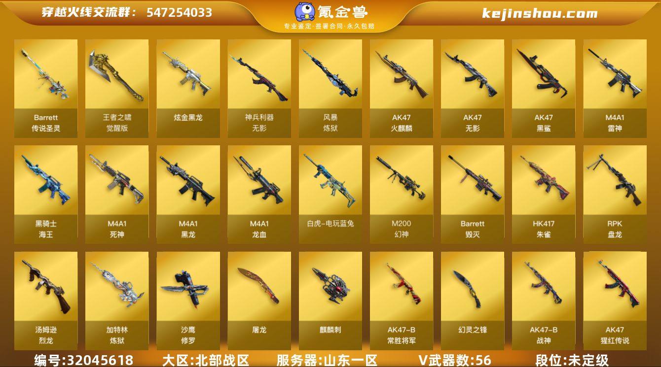 山东一区-62V-6王者武器数-1炫金武器数 【传说武器】:传说圣灵 【热门武器】:传说圣灵,HK417-朱雀,M200-幻神,死亡之眼,白虎-电玩蓝兔,Kar98K-星神,汤姆逊-烈龙*6,RPK-盘龙*6,加特林-炼狱,斯泰尔-蝴蝶,羊驼玩偶,沙鹰-修罗,金刚伞 【王者炫金武器】:炫金黑龙 【音效卡】:烈火-动感闪耀 音效卡,M4A1-黑骑士音效卡 【皮肤】:幻神-动感闪耀 皮肤,AWM-裁决-百城联赛天津皮肤,雷神-暗月,雷神-荣耀之魄,雷神-星空,雷神-耀金皮肤,雷神-冠军之魄,雷神-机甲刑天皮肤,雷神-宇航兔皮肤,火麒麟-雷神,火麒麟-平天大圣,火麒麟-百城,火麒麟-心动糖果,毁灭-暗月,毁灭-星空,毁灭-风暴*2,黑骑士-暗月,无影-能量核心,无影-神兵利器 皮肤,死神-机甲核心皮肤,战神-粉色甜心皮肤,战神-紫绶金章皮肤,战神-流金岁月皮肤*2,AK47-B-常胜将军-曹操*2,AK47-B-常胜将军-刘备,AK47-B-常胜将军-孙权,炼狱-星空,炼狱-玩具枪皮肤,炼狱-月 皮肤 【角色】:炫,战地猎狐,王者葵-惊若翩鸿,乔伊教练,修道士,暗夜-X,北极狐-X,初恋灵狐,芳心审判者,风暴女*2,虎妞,嘉年华灵狐,娟娟,灵狐者-X,灵狐者-黄金海岸,灵狐者-七夕宝贝,灵狐者-职业经理,龙儿,龙儿-小淘气,麻雀,曼陀罗-礼服,潘多拉-X,潘多拉-甜心教官,潜龙队-X,青霞仙子,斯沃特-X,蜀雪,铁骑荣耀,兔囡囡,新娜塔莎,雪莉杨-摸金校尉,樱-青春偶像,樱-战斗天使,影武者-X 【人偶武器】:斯泰尔-蝴蝶,巴雷特-零-水下丽影,AWM-灵狐-15周年嘉年华,M37-葵,迷你深渊冰龙,迷你裂空之翼,迷你牛魔王,迷你波特博士*3,夺魂*2,迷你牛牛*4,迷你生化手雷,生化手雷-机甲核心,深渊终结者手雷,闪光弹-小乔,闪光弹-貂蝉,高爆手雷-大乔,迷你艾比,迷你超能女侍,迷你巨石泰坦-魔花研究所 【暴走生化】:黑龙吞噬者,死亡之眼,超...