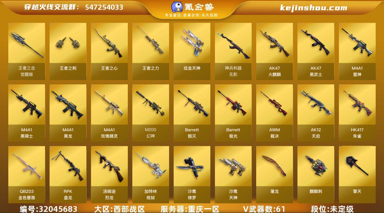 重庆一区-63V-6王者-1炫金 【热门武器】:QBZ03-金色蔷薇,HK417-朱雀*2,M200-幻神,死亡之眼,M4A1-黑骑士,汤姆逊-烈龙*6,RPK-盘龙*2,加特林-炼狱*5,斯泰尔-蝴蝶,USP-雷暴,沙鹰-修罗*4,荣耀世冠-龙啸 【王者炫金武器】:王者之心,王者之力,王者之刺,炫金天神 【音效卡】:修罗-云海游龙音效卡,M200-幻神音效卡,AK47-火麒麟音效卡,M4A1-雷神音效卡,M4A1-黑骑士音效卡,Barrett-毁灭音效卡 【皮肤】:幻神-丹凤,雷神-耀金皮肤,火麒麟-华夏之心,毁灭-星空,M4A1-千变-孔明皮肤,黑龙-暗月,黑骑士耀金皮肤,无影耀金皮肤,AK47-B-常胜将军-曹操,AK47-B-常胜将军-刘备,AK47-B-常胜将军-孙权 【角色】:零,魅影,王者零-华冠丽服,王者-救世主,暗夜-X,风暴女,嘉年华灵狐,零-热舞青春,零-水下丽影,灵狐者-职业经理,龙儿,曼陀罗-X,潘多拉-X,潘多拉-甜心教官,青霞仙子 【人偶武器】:斯泰尔-蝴蝶,AWM-灵狐-15周年嘉年华*2,闪光弹-貂蝉,高爆手雷-大乔 【暴走生化】:死亡之眼,超级对讲机 【挑战大师】:神圣爆裂者III 【英雄级武器】:AK47-火麒麟,M4A1-黑龙,M4A1-雷神,M4A1-黑骑士,AK47-黑武士,AK12-天启,HK417-朱雀*2,无影-神兵利器,M4A1-玫瑰精灵,QBZ03-金色蔷薇,AK47-B-常胜将军,Barrett-毁灭*2,Barrett-极光,AWM-裁决,M200-幻神,Barrett-金色蔷薇,RPK-盘龙*2,加特林-炼狱*5,汤姆逊-烈龙*6,沙鹰-修罗*4,沙鹰-天神*2,USP-雷暴,屠龙,擎天*4,麒麟刺*2,荣耀世冠-龙啸,斩神刀-雷暴,王者之锋-觉醒版,王者之击-觉醒版*2,高爆手雷-雷暴*4,闪光弹-雷暴*4,烟雾弹-雷暴*4 【道具】:超级背包,女皇终结者-魔龙之吻,灵魂忍者,妖姬,迷雾幽灵,夺命之镰,防化服,金色流光-枪王排位*2,流光-鎏金之域,防弹头盔,防弹衣,C4工具钳,手雷包 【特殊枪械】:蝴...