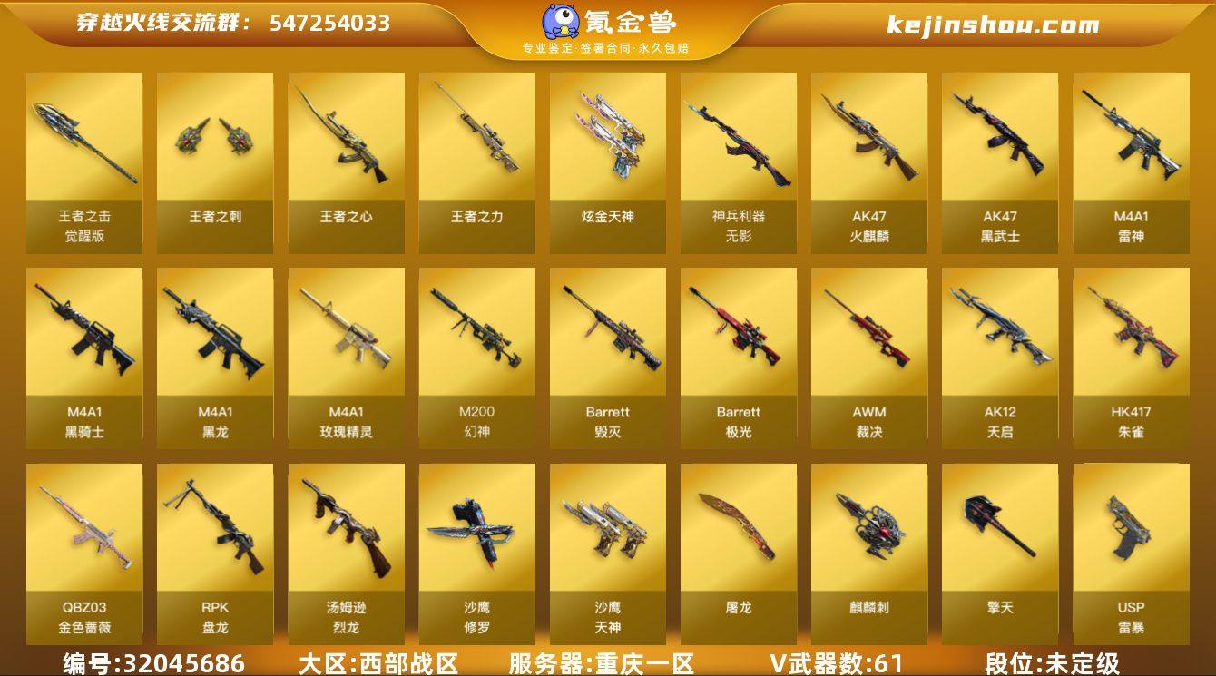 重庆一区-63V-6王者-1炫金 【热门武器】:QBZ03-金色蔷薇,HK417-朱雀*2,M200-幻神,死亡之眼,M4A1-黑骑士,汤姆逊-烈龙*6,RPK-盘龙*2,加特林-炼狱*5,斯泰尔-蝴蝶,USP-雷暴,沙鹰-修罗*4,荣耀世冠-龙啸 【王者炫金武器】:王者之心,王者之力,王者之刺,炫金天神 【音效卡】:修罗-云海游龙音效卡,M200-幻神音效卡,AK47-火麒麟音效卡,M4A1-雷神音效卡,M4A1-黑骑士音效卡,Barrett-毁灭音效卡 【皮肤】:幻神-丹凤,雷神-耀金皮肤,火麒麟-华夏之心,毁灭-星空,M4A1-千变-孔明皮肤,黑龙-暗月,黑骑士耀金皮肤,无影耀金皮肤,AK47-B-常胜将军-曹操,AK47-B-常胜将军-刘备,AK47-B-常胜将军-孙权 【角色】:零,魅影,王者零-华冠丽服,王者-救世主,暗夜-X,风暴女,嘉年华灵狐,零-热舞青春,零-水下丽影,灵狐者-职业经理,龙儿,曼陀罗-X,潘多拉-X,潘多拉-甜心教官,青霞仙子 【人偶武器】:斯泰尔-蝴蝶,AWM-灵狐-15周年嘉年华*2,闪光弹-貂蝉,高爆手雷-大乔 【暴走生化】:死亡之眼,超级对讲机 【挑战大师】:神圣爆裂者III 【英雄级武器】:AK47-火麒麟,M4A1-黑龙,M4A1-雷神,M4A1-黑骑士,AK47-黑武士,AK12-天启,HK417-朱雀*2,无影-神兵利器,M4A1-玫瑰精灵,QBZ03-金色蔷薇,AK47-B-常胜将军,Barrett-毁灭*2,Barrett-极光,AWM-裁决,M200-幻神,Barrett-金色蔷薇,RPK-盘龙*2,加特林-炼狱*5,汤姆逊-烈龙*6,沙鹰-修罗*4,沙鹰-天神*2,USP-雷暴,屠龙,擎天*4,麒麟刺*2,荣耀世冠-龙啸,斩神刀-雷暴,王者之锋-觉醒版,王者之击-觉醒版*2,高爆手雷-雷暴*4,闪光弹-雷暴*4,烟雾弹-雷暴*4 【道具】:超级背包,女皇终结者-魔龙之吻,灵魂忍者,妖姬,迷雾幽灵,夺命之镰,防化服,金色流光-枪王排位*2,流光-鎏金之域,防弹头盔,防弹衣,C4工具钳,手雷包 【特殊枪械】:蝴...