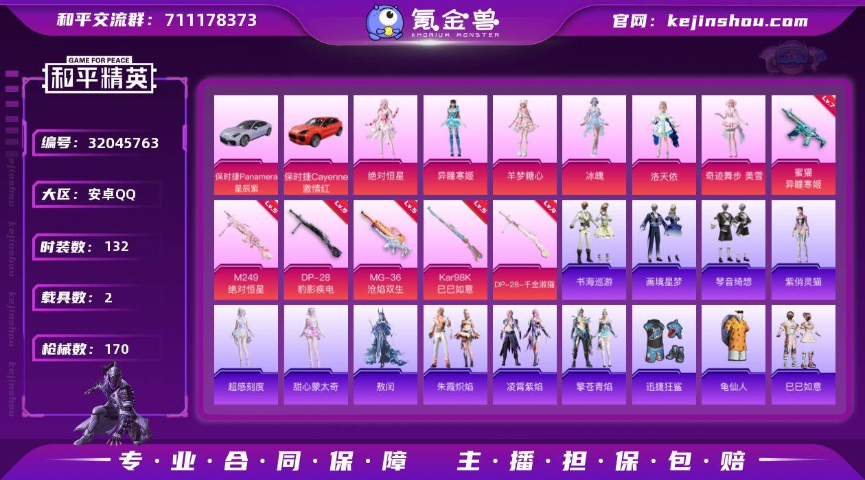 安卓 手Q-6粉装-7特效枪-2载具-4粉色飞行器-52110热力值-5王牌印记-132套装-170枪皮 【热门品类】:套装-龟仙人 【粉色套装】:角色-绝对恒星,角色-洛天依,角色-奇迹舞步 美雪,角色-冰魄,角色-羊梦糖心,角色-异瞳寒姬 【粉色枪皮等级】:AKM-暮色玫影(三级),蜜獾-异瞳寒姬(七级),Kar98K-巳巳如意(五级),M249-绝对恒星(五级),DP-28-千金淑猫(四级),DP-28-豹影疾电(五级),MG-36-沧焰双生(五级) 【粉色载具】:保时捷Panamera(星辰紫),保时捷Cayenne(激情红) 【粉色枪皮】:AKM-暮色玫影,蜜獾-异瞳寒姬,Kar98K-巳巳如意,M249-绝对恒星,DP-28-千金淑猫,DP-28-豹影疾电,MG-36-沧焰双生 【粉色飞行器】:绝对恒星飞行器,炫彩糖果飞行器,飞天猪飞行器,暮色之舞飞行器 【粉色降落伞】:绝对恒星降落伞,洛神天依降落伞,精灵梦叶罗丽降落伞,千金淑猫降落伞,奇迹舞步降落伞,魔童闹海 哪吒降落伞,异瞳寒姬降落伞,炫彩糖果降落伞,暮色玫影降落伞 【稀有套装】:套装-龟仙人,套装-巳巳如意,角色-超感刻度,角色-甜心蒙太奇,套装-雪国风尚,套装-炫彩糖果,角色-都市丽猫,角色-摩登魅猫,角色-怀庆长公主,套装-蓝海鲸歌,角色-夜瞳黯灵,套装-朱霞炽焰,套装-凌霄紫焰,套装-擎苍青焰,角色-敖闰,角色-紫俏灵猫,套装-书海巡游,套装-画境星梦,套装-琴音绮想,套装-红釉青花 【稀有枪皮】:AUG-冰晶雪宝,AKM-破晓战魂,AKM-虎虎生威,AKM-龙的传人,M16A4-幻世战舞者,M16A4-红色方程式,M16A4-千金淑猫,SCAR-L-夜灯,SCAR-L-炫彩节奏,SCAR-L-玉兔迎春,SCAR-L-红色方程式,M416-糯团青竹,M416-红色方程式,M416-蓝色火焰,GROZA-恐龙拽拽,GROZA-田园牧歌,GROZA-荧海星豚,GROZA-暮色玫影,AUG-天降萌叽,AUG-耀粉歌者,AUG-绝对恒星,QBZ-彩虹符号,QBZ-洛神天依,M762-天降萌叽...