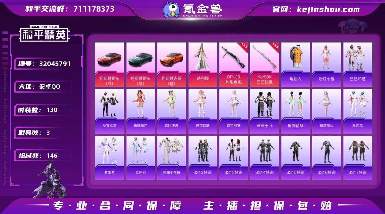 时装数: 130 载具数: 3 枪械数: 146 战备数: 118 热门装扮: 萨利娅 载具: 阿斯顿·马丁DBS(红),阿斯顿·马丁DBS(绿),阿斯顿·马丁DBX(橙) 稀有枪皮: 五级Kar98K-巳巳如意,五级DP-28-豹影疾电