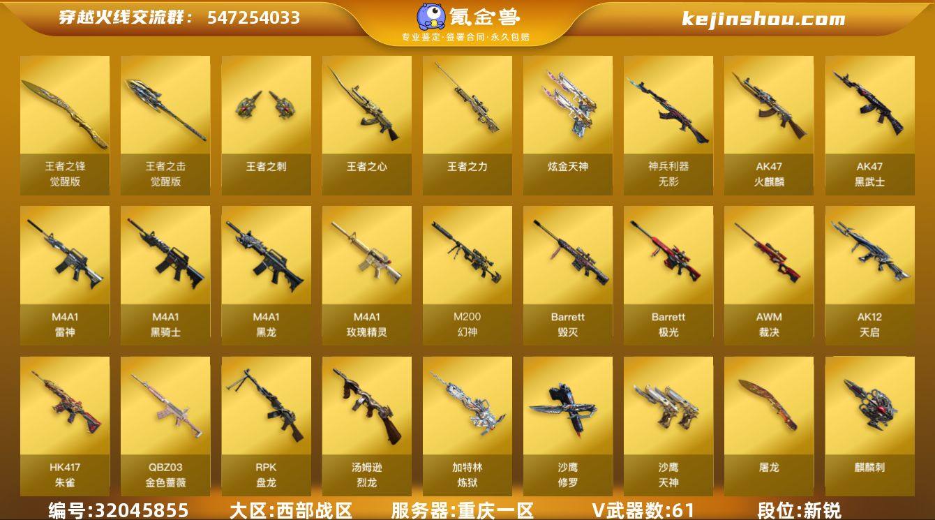 重庆一区-63V-6王者-1炫金 【热门武器】:QBZ03-金色蔷薇,HK417-朱雀*2,M200-幻神,死亡之眼,M4A1-黑骑士,汤姆逊-烈龙*6,RPK-盘龙*2,加特林-炼狱*5,斯泰尔-蝴蝶,USP-雷暴,沙鹰-修罗*4,荣耀世冠-龙啸 【王者炫金武器】:王者之心,王者之力,王者之刺,炫金天神 【音效卡】:修罗-云海游龙音效卡,M200-幻神音效卡,AK47-火麒麟音效卡,M4A1-雷神音效卡,M4A1-黑骑士音效卡,Barrett-毁灭音效卡 【皮肤】:幻神-丹凤,雷神-耀金皮肤,火麒麟-华夏之心,毁灭-星空,M4A1-千变-孔明皮肤,黑龙-暗月,黑骑士耀金皮肤,无影耀金皮肤,AK47-B-常胜将军-曹操,AK47-B-常胜将军-刘备,AK47-B-常胜将军-孙权 【角色】:零,魅影,王者零-华冠丽服,王者-救世主,暗夜-X,风暴女,嘉年华灵狐,零-热舞青春,零-水下丽影,灵狐者-职业经理,龙儿,曼陀罗-X,潘多拉-X,潘多拉-甜心教官,青霞仙子 【人偶武器】:斯泰尔-蝴蝶,AWM-灵狐-15周年嘉年华*2,闪光弹-貂蝉,高爆手雷-大乔 【暴走生化】:死亡之眼,超级对讲机 【挑战大师】:神圣爆裂者III 【英雄级武器】:AK47-火麒麟,M4A1-黑龙,M4A1-雷神,M4A1-黑骑士,AK47-黑武士,AK12-天启,HK417-朱雀*2,无影-神兵利器,M4A1-玫瑰精灵,QBZ03-金色蔷薇,AK47-B-常胜将军,Barrett-毁灭*2,Barrett-极光,AWM-裁决,M200-幻神,Barrett-金色蔷薇,RPK-盘龙*2,加特林-炼狱*5,汤姆逊-烈龙*6,沙鹰-修罗*4,沙鹰-天神*2,USP-雷暴,屠龙,擎天*4,麒麟刺*2,荣耀世冠-龙啸,斩神刀-雷暴,王者之锋-觉醒版,王者之击-觉醒版*2,高爆手雷-雷暴*4,闪光弹-雷暴*4,烟雾弹-雷暴*4 【道具】:超级背包,女皇终结者-魔龙之吻,灵魂忍者,妖姬,迷雾幽灵,夺命之镰,防化服,金色流光-枪王排位*2,流光-鎏金之域,防弹头盔,防弹衣,C4工具钳,手雷包 【特殊枪械】:蝴...