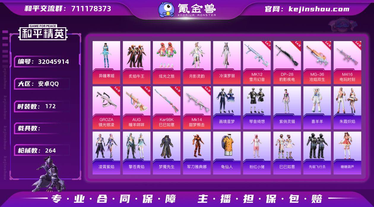 J1976 【性价比满级枪号】5粉 8特 异瞳寒姬 冷漠罗丽 花灵 满级枪*7 安卓 手Q-5粉装-8特效枪-0载具-4粉色飞行器-78027热力值-2王牌印记-172套装-264枪皮 【热门品类】:角色-军刀雅典娜,套装-龟仙人,套装-粉红小猪 【粉色套装】:粉装-炙焰牛王,粉装-炫光之旅,角色-月影灵韵,角色-冷漠罗丽,角色-异瞳寒姬 【粉色枪皮等级】:M416-电玩时刻(五级),GROZA-镜光银凌(五级),AUG-暖羊咩咩(五级),Kar98K-巳巳如意(五级),Mk14-甜梦熊击(五级),MK12-雪月幻音(七级),DP-28-豹影疾电(五级),MG-36-沧焰双生(五级) 【粉色枪皮】:M416-电玩时刻,GROZA-镜光银凌,AUG-暖羊咩咩,Kar98K-巳巳如意,Mk14-甜梦熊击,MK12-雪月幻音,DP-28-豹影疾电,MG-36-沧焰双生 【粉色飞行器】:时光之誓飞行器,桃源时光飞行器,极意拳锋飞行器 【粉色降落伞】:洛神天依降落伞,环太平洋降落伞,暗夜鎏金降落伞,辉耀战甲降落伞,江南烟雨降落伞,初号机 觉醒Ver.降落伞,鬼刀降落伞,幻影飞狐降落伞,幻彩电音降落伞,时光之吻降落伞,荧海星豚降落伞,绯穹魔姬降落伞,喜羊羊与灰太狼降落伞,极意拳锋降落伞,炫彩糖果降落伞 【稀有套装】:套装-龟仙人,套装-巳巳如意,套装-雪国风尚,套装-炫彩糖果,套装-先驱飞行员,套装-糖糖葫芦,套装-青团波波,套装-燕燕于飞,套装-鱼渊荷华,角色-海琴烟,套装-粉恋花,套装-紫幽梦,套装-蓝冰羽,套装-霓虹热舞,套装-极速光影,套装-彩虹兔,套装-云朵鹅,套装-雪绒豹,角色-灵公主,套装-朱霞炽焰,套装-凌霄紫焰,套装-擎苍青焰,玩偶服-喜羊羊,角色-紫俏灵猫,套装-画境星梦,套装-琴音绮想,角色-月烬之祷 【稀有枪皮】:M79短管榴弹-钛晶裂爪,AKM-彩虹符号,AKM-星兔领航员,AKM-江南烟雨,AKM-灼热熔岩,AKM-破晓战魂,AKM-霓虹街区,AKM-龙的传人,M16A4-幻世战舞者,M1...