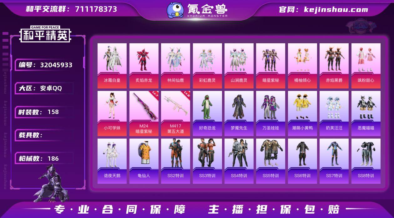 安卓 手Q-10粉装-2特效枪-0载具-58029热力值-6印记-158套装-186枪皮 【特效枪等级】:M24-暗星紫秘(七级),M417-第五大道(六级) 【优质套装】:粉装-冰霜白皇,粉装-炙焰赤龙,粉装-林间仙鹿,粉装-彩虹鹿灵,粉装-山涧鹿灵,粉装-暗星紫秘,粉装-橘柚倾心,粉装-赤焰黑爵,粉装-飒粉甜心,角色-小可学妹 【稀有套装】:套装-龟仙人 【优质武器皮肤】:M24-暗星紫秘,M417-第五大道 【稀有武器皮肤】:AKM-夜灯,AKM-小鹦鹉BEBE,AKM-彩虹符号,AKM-恐龙拽拽,AKM-灼热熔岩,AKM-破晓战魂,AKM-筑梦精灵,AKM-虎虎生威,AKM-霓虹街区,AKM-龙的传人,M16A4-幻世战舞者,M16A4-甜心亚梦,M16A4-生命誓言,M16A4-红色方程式,M16A4-魔法学院,SCAR-L-生命誓言,SCAR-L-碧影闪光,SCAR-L-红色方程式,SCAR-L-雷霆特警,M416-彩虹嘻嘻猴,M416-暗星紫秘,M416-月影鸳鸯,M416-糯团青竹,M416-红色方程式,M416-绯红前夜,M416-蓝色火焰,GROZA-异彩先驱,GROZA-恐龙拽拽,GROZA-懵萌河马,GROZA-林间仙鹿,GROZA-生命誓言,GROZA-银河战甲,GROZA-雷霆特警,GROZA-马卡龙,GROZA-黑色刀锋,AUG-天降萌叽,AUG-幻梦音符,AUG-耀粉歌者,QBZ-妙趣可丽,QBZ-未来歌姬,QBZ-洛神天依,QBZ-诡娃娃,QBZ-飞驰魅影,M762-天降萌叽,M762-拳皇97,M762-瑞龙福将,M762-第五大道,M762-诡娃娃,Mk47-天之羽翼,Mk47-妙红点点,Mk47-林间仙鹿,Mk47-洛神天依,G36C-六号树人,G36C-冷魅冰骑,G36C-懵萌河马,AC-VAL-彩虹甜喵,AC-VAL-甜心亚梦,蜜獾-天降萌叽,UZI-生命誓言,UZI-红色方程式,UMP45-涂山之恋,UMP45-灵符少年,UMP45-炫光之旅,UMP45-生命誓言,UMP45-诡娃娃,Vector-生命誓言,Vector-黑色刀锋,汤姆逊-异彩先驱,汤姆逊-林间仙鹿,汤姆逊-炫彩节奏,汤姆逊-耀粉歌者,野牛-天星战神,MP5K-异彩先驱,MP5K-蓝莓...