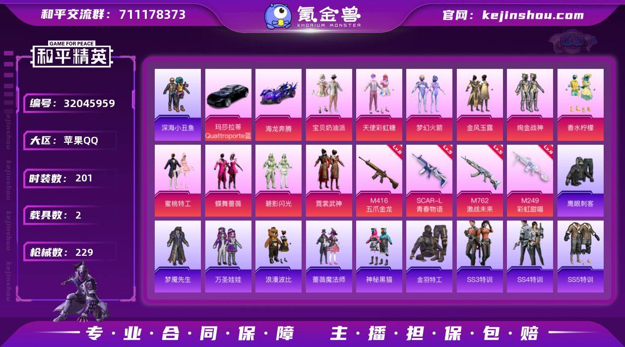 苹果 手Q-10粉装-4特效枪-2载具-72245热力值-15印记-201套装-229枪皮 【稀有载具】:玛莎拉蒂Quattroporte(夜幕蓝),海龙奔腾 【特效枪等级】:SCAR-L-青春物语(五级),M416-五爪金龙(六级),M762-激战未来(五级),M249-彩虹甜喵(四级) 【优质套装】:粉装-宝贝奶油派,粉装-天使彩虹糖,粉装-梦幻火箭,粉装-金风玉露,粉装-绚金战神,粉装-香水柠檬,粉装-蜜桃特工,粉装-蝶舞蔷薇,粉装-碧影闪光,粉装-霓裳武神 【优质武器皮肤】:SCAR-L-青春物语,M416-五爪金龙,M762-激战未来,M249-彩虹甜喵 【稀有武器皮肤】:AKM-四圣焕新,AKM-夜灯,AKM-天启纪元,AKM-彩虹符号,AKM-春暖花开,AKM-灼热熔岩,AKM-破晓战魂,AKM-萌趣颜团子,AKM-虎虎生威,AKM-霓虹街区,AKM-龙的传人,M16A4-夜灯,M16A4-机械英豪,M16A4-甜心亚梦,M16A4-红色方程式,M16A4-蓝色火焰,SCAR-L-炫彩节奏,SCAR-L-玉兔迎春,SCAR-L-王牌四分卫,SCAR-L-红色方程式,SCAR-L-黄金龙骨,SCAR-L-龙宫之主,M416-仓鼠灰灰,M416-动感兔斯基,M416-滑板小狐,M416-神秘黑猫,M416-糯团青竹,M416-红色方程式,M416-蓝色火焰,GROZA-异彩先驱,GROZA-影袭,GROZA-治愈之星,GROZA-生命誓言,GROZA-黑色刀锋,AUG-凝视深渊,AUG-天降萌叽,AUG-幻影战神,AUG-耀粉歌者,AUG-青春冒险家,AUG-魔法学院,QBZ-原初圣火,QBZ-彩虹符号,QBZ-洛神天依,QBZ-神秘黑猫,QBZ-诡娃娃,QBZ-赛罗,QBZ-飞驰魅影,M762-天降萌叽,M762-彩虹甜喵,M762-拳皇97,M762-牛气冲天,M762-瑞龙福将,M762-甜心宝贝,M762-生命誓言,M762-绯红前夜,M762-诡娃娃,M762-镭射皇者,Mk47-青春冒险家,G36C-不夜海上花,G36C-荒野猎神,AC-VAL-天降萌叽,AC-VAL-彩虹甜喵,AC-VAL-甜心亚梦,蜜獾-天降萌叽,蜜獾-娇憨猪猪,UZI-众神之王,UZI-娇憨猪猪,UZI-生命誓言...