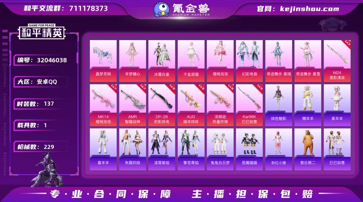 J2123 【性价比女号】8粉 9特 1载 霁蓝缠春 羊梦糖心 幻彩电音 樱桃泡泡 千金淑猫 冰霜白皇 满级枪*7 安卓 手Q-8粉装-9特效枪-1载具-4粉色飞行器-66550热力值-2王牌印记-137套装-229枪皮 【热门品类】:套装-粉红小猪 【粉色套装】:粉装-冰霜白皇,角色-千金淑猫,角色-樱桃泡泡,粉装-幻彩电音,角色-奇迹舞步 美琪,角色-奇迹舞步 美雪,角色-羊梦糖心,角色-霁蓝缠春 【粉色枪皮等级】:AUG-暖羊咩咩(五级),汤姆逊-热量炸弹(五级),Kar98K-巳巳如意(五级),M24-莲影清波(七级),Mk14-樱桃泡泡(七级),AMR-智耀战神(七级),DP-28-豹影疾电(五级) 【粉色载具】:晶梦灵驹 【粉色枪皮】:AUG-暖羊咩咩,汤姆逊-热量炸弹,Kar98K-巳巳如意,M24-莲影清波,Mk14-樱桃泡泡,Mk14-福马献瑞,AMR-智耀战神,DP-28-豹影疾电 【粉色飞行器】:炫彩糖果飞行器,彩虹独角兽飞行器,月下星之子飞行器,奇迹舞步飞行器 【粉色降落伞】:童趣迷兔降落伞,青春物语降落伞,恐龙拽拽降落伞,筑梦精灵降落伞,莲影清波降落伞,蜜语绒猫降落伞,千金淑猫降落伞,晶梦幻蝶降落伞,彩虹独角兽降落伞,樱桃泡泡降落伞,绯果甜心降落伞,幻彩电音降落伞,荧海星豚降落伞,绯穹魔姬降落伞,喜羊羊与灰太狼降落伞,异瞳寒姬降落伞,炫彩糖果降落伞,罪夜之冕降落伞,辉云木星降落伞 【稀有套装】:玩偶服-憨乐熊二,套装-巳巳如意,套装-乐游熊熊,套装-雪国风尚,套装-炫彩糖果,套装-顽皮橙,角色-俏兔智灵,角色-光矢逐梦,套装-燕燕于飞,套装-鱼渊荷华,套装-迷雾之月,玩偶服-小狗蛇点点,套装-晶灵使者,套装-晶辉守护,角色-糖霜甜心,角色-蜜桃派对,套装-新风雅兰,套装-粉恋花,套装-紫幽梦,套装-蓝冰羽,角色-鲛海歌灵,套装-极速光影,套装-彩虹兔,套装-云朵鹅,套装-雪绒豹,角色-时希公主,角色-绛羽幽主,套装-朱霞...