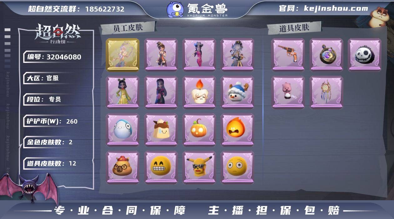 金皮2;紫皮5;道具皮12;皮肤:逍遥-莲华渡,兰-春之声,小黄-呱呱雨衣,莉莉-除妖小师妹,爱丽丝-丝缕哀歌,爱丽丝-耀眼的你,阿念-庆宴绮愿;道具:腰包-惊魂娃娃,除颤仪-冰晶般的代价,音响-月光奏鸣曲,电击枪-权杖的许诺,腰包-红运福虎,转轮手枪-新星时代,音响-鸣沙鼓,短管猎枪-赞萌露比水枪,摸金符-海洋之心,传送按钮-逆时审判,急救包-蔷薇物语,伞-伞;美妆:美妆-萌兔气泡;饰品:头饰-卑微头套,头饰-嘻嘻头套,头饰-面具马头套,头饰-炙热烧烤,头饰-呆滞头套,头饰-惊魂南瓜头套,头饰-滑稽头套,头饰-鳄霸天头套,头饰-烛光纪念,头饰-蒜了八,头饰-大葱明头套,头饰-园丁鲨鲨头套,头饰-烈焰红唇头套,头饰-太空鲨头套,头饰-鱼头怪头套,头饰-小狗蛇点点头套,头饰-萨卡班甲鱼头套,头饰-樱桃奶油布丁,头饰-雪墩墩头套,头饰-哈士奇头套,头饰-饺饺者头套,头饰-小财神豚豚头套,头饰-火爆了头套,头饰-马上有钱,头饰-像素朋克墨镜,头饰-后室幸存者头套,挂饰-未竟乐园,挂饰-晚安小熊,挂饰-尘封旧事,挂饰-拂云仙,挂饰-天使消失的年代,背饰-蝶恋花,背饰-牛啤背包,背饰-子夜证词,背饰-醉花阴;动作:动作-来财舞,动作-鸳鸯戏,动作-luvaboy,动作-金城舞,动作-舞台中心,动作-新年摇,动作-鞭子舞,动作-抬手,动作-举牌,动作-要糖,动作-拜年;工牌背景:工牌背景-卷珠帘,工牌背景-佛系小豚,工牌背景-永夜巡礼,工牌背景-鸢尾花,工牌背景-心同野鹤;工牌动作:工牌动作-春色盈怀,工牌动作-蜕变,工牌动作-鸦影,工牌动作-净禅;员工:兰,员工-薇薇安,员工-阿念,员工-莉莉,员工-零,员工-临云,员工-巫铃儿,员工-爱德华,员工-小满,员工-小黄,员工-艾伦,员工-逍遥,员工-爱丽丝;累充494元;铲铲币26.0万;金砖0;段位:专员Ⅳ;魔盒等级:31; 【账号已绑定信息】:密保手机