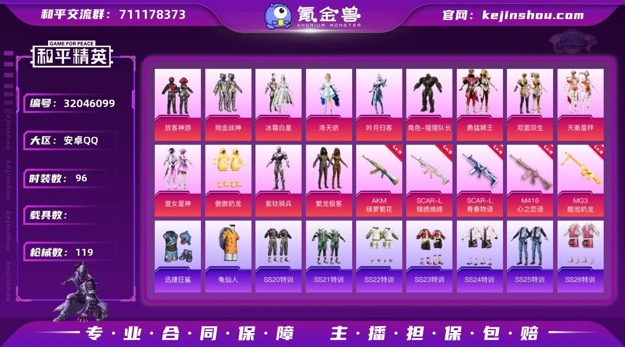 安卓 手Q-13粉装-5特效枪-0载具-37915热力值-8印记-96套装-119枪皮 【特效枪等级】:AKM-绿萝繁花(五级),SCAR-L-青春物语(四级),SCAR-L-锦绣绵绵(五级),M416-心之恋语(四级),MG3-酷泡奶龙(四级) 【优质套装】:粉装-放客神游,粉装-绚金战神,粉装-冰霜白皇,角色-洛天依,粉装-吟月归客,角色-猩猩队长,粉装-勇猛狮王,粉装-双面双生,粉装-天衡星秤,粉装-室女星神,粉装-傲傲奶龙,角色-紫钛骑兵,粉装-繁龙极客 【稀有套装】:套装-龟仙人 【优质武器皮肤】:AKM-绿萝繁花,SCAR-L-青春物语,SCAR-L-锦绣绵绵,M416-心之恋语,MG3-酷泡奶龙 【稀有武器皮肤】:AKM-彩虹符号,AKM-破晓战魂,AKM-霓虹街区,AKM-龙的传人,M16A4-幻世战舞者,M16A4-蓝色火焰,SCAR-L-玉兔迎春,SCAR-L-红色方程式,SCAR-L-黄金龙骨,M416-糯团青竹,M416-红色方程式,M416-蓝色火焰,GROZA-彩虹符号,GROZA-懵萌河马,GROZA-田园牧歌,AUG-天降萌叽,AUG-耀粉歌者,QBZ-彩虹符号,QBZ-未来歌姬,M762-天降萌叽,M762-彩虹甜喵,M762-彩虹符号,Mk47-妙红点点,Mk47-炫光之旅,G36C-懵萌河马,AC-VAL-天降萌叽,AC-VAL-快闪甜心,蜜獾-天降萌叽,蜜獾-娇憨猪猪,UZI-啾咪啾咪,UZI-天降萌叽,UZI-娇憨猪猪,UMP45-夜灯,UMP45-涂山之恋,UMP45-生命誓言,Vector-焰鹰斗篷,Vector-生命誓言,Vector-田园牧歌,Vector-风花雪月,汤姆逊-天降萌叽,汤姆逊-耀粉歌者,P90-快闪甜心,P90-飞驰魅影,AWM-焰鹰斗篷,AWM-圣堂之誓,AWM-恐龙拽拽,SKS-心之恋语,SKS-未来歌姬,VSS-彩虹符号,VSS-田园牧歌,VSS-绿野极光,Mini14-涂山之恋,Mini14-熔岩统帅,Mk14-童趣迷兔,SLR-娇憨猪猪,SLR-彩虹符号,莫辛纳甘-懵萌河马,AMR-妙红点点,M417-惊鸿侠骨,MK20-H-快闪甜心,M200-惊鸿侠骨,S1897-暗夜鎏金,S1897-炫彩节奏,S12K-...