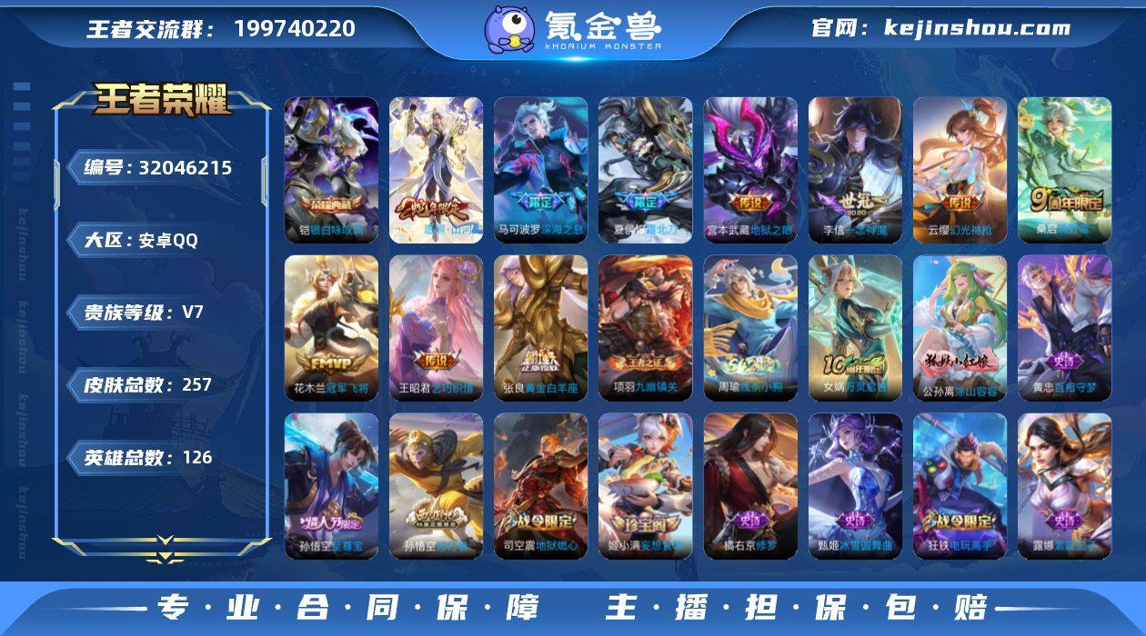 【257皮1典藏10传说 银白咏叹调 愿照山河定 霜北刀 至尊宝 深海之息】安卓Q-V7-最强王者段位-126英雄-257皮肤-1典藏皮肤-10传说-69史诗 【英雄全皮】:司空震全皮,影全皮 【荣耀典藏】:铠银白咏叹调 【传说皮肤】:司空震愿照山河定,云缨幻光神枪,桑启鸣野蒿,夏侯惇霜北刀,马可波罗深海之息,王昭君乞巧织情,李信一念神魔,张良黄金白羊座,花木兰冠军飞将,宫本武藏地狱之眼 【限定皮肤】:夏侯惇霜北刀,姜子牙天穹之誓,杨戬破阵退雄兵,李白谪仙醉月,狄仁杰阴阳师,赵云皇家上将,孙尚香蔷薇恋人,钟无艳王者之锤,钟无艳超时空战士,扁鹊奇幻香踪,芈月幻夜卜梦,元歌无心,甄姬落雪兰心,马可波罗深海之息,狄仁杰魔术师,狄仁杰万华元夜,达摩沙漠行僧,项羽海滩派对,老夫子航海奇遇记,程咬金演武夺筹,韩信逐梦之影,王昭君午后时光,兰陵王金庭之子,孙悟空至尊宝,孙悟空孙行者,李元芳云中旅人,钟馗驱傩正仪,杨戬潮玩骑兵,雅典娜单词大作战,雅典娜黎明之约,鬼谷子原初探秘者,鬼谷子五谷丰年,黄忠火炮绅士,苏烈千军破阵,百里玄策原初追逐者,梦奇顽趣,沈梦溪大漠名商,裴擒虎李小龙,裴擒虎擒涛扼浪,狂铁电玩高手,嫦娥拒霜思,嫦娥暖冬兔眠,西施玲珑珍味,蒙犽狂想玩偶喵,鲁班大师探海日志,桑启海盐诗旅,暃星界游侠,戈娅驭风魔法,艾琳流音漫舞,司空震地狱燃心,阿古朵江河有灵,张良古海寻踪,蒙恬荣光圣徽,高渐离燃音魔法,妲己灵卜魔法,鬼谷子天穹祈灯,姬小满妄想食味,沈梦溪龙舞盛年,刘邦剑破天穹,程咬金群星魔术团,镜青焰无极,项羽苍威无极,刘备异域游侠,周瑜熔金海岸 【年限皮肤】:司空震愿照山河定 【赛季限定】:鬼谷子原初探秘者,狄仁杰万华元夜,程咬金演武夺筹,钟馗驱傩正仪,苏烈千军破阵,达摩沙漠行僧,兰陵王金庭之子,沈梦溪大漠名商,李元芳...