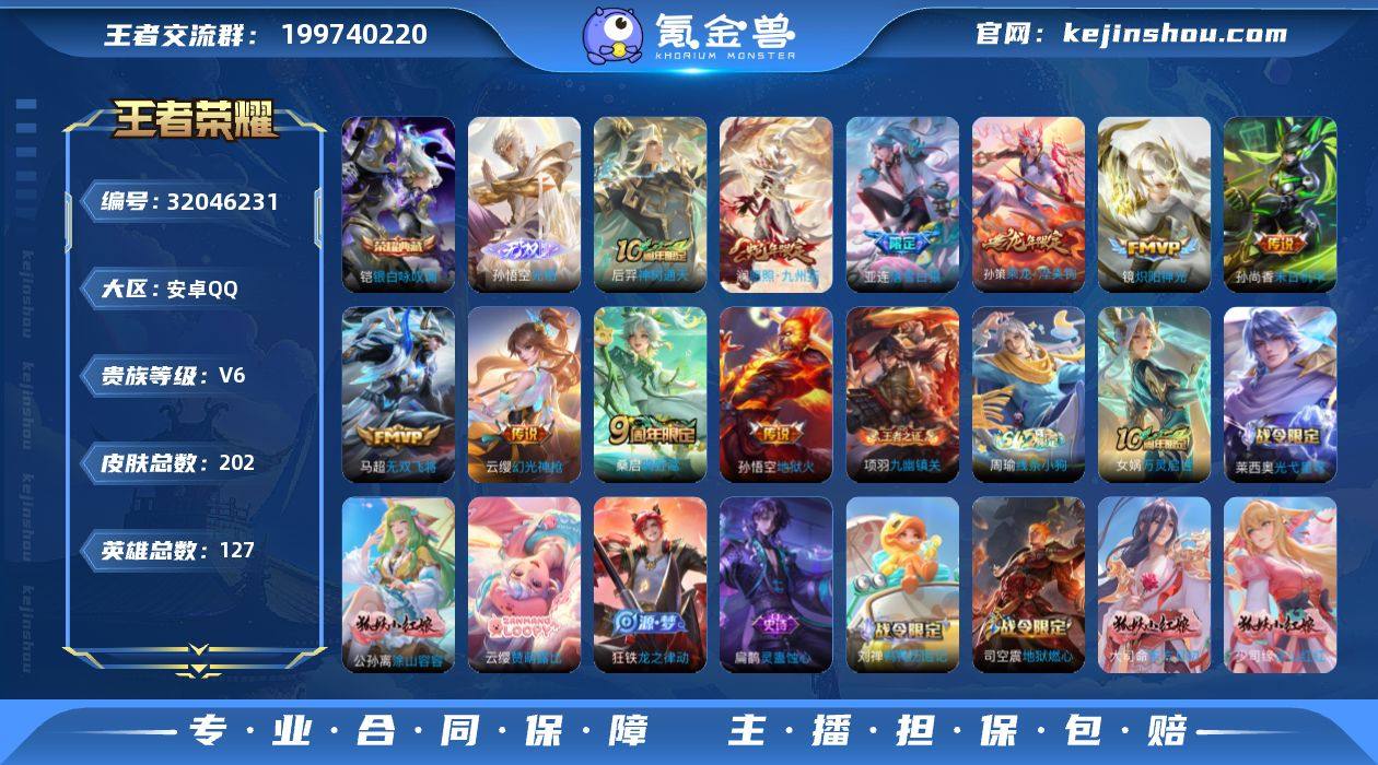 【202皮1典藏1无双10传说(还有3000多星币) 猴哥无相 银白咏叹调 落雪白狼 乘龙淬吴钩 无双飞将】安卓Q-V6-最强王者段位-127英雄-202皮肤-1典藏皮肤-1无双-10传说-64史诗 【英雄全皮】:孙权全皮,蒙恬全皮,影全皮 【荣耀典藏】:铠银白咏叹调 【无双皮肤】:孙悟空无相 【传说皮肤】:后羿神树通天,澜愿照九州拓,云缨幻光神枪,桑启鸣野蒿,亚连落雪白狼,孙策乘龙淬吴钩,马超无双飞将,镜炽阳神光,孙尚香末日机甲,孙悟空地狱火 【限定皮肤】:姜子牙天穹之誓,李白谪仙醉月,狄仁杰阴阳师,赵云皇家上将,芈月白晶晶,狄仁杰魔术师,项羽海滩派对,老夫子航海奇遇记,杨玉环遇见飞天,雅典娜黎明之约,百里玄策原初追逐者,裴擒虎擒涛扼浪,云中君纤云弄巧,鲁班大师探海日志,艾琳流音漫舞,司空震地狱燃心,阿古朵江河有灵,张良古海寻踪,蒙恬荣光圣徽,高渐离燃音魔法,妲己灵卜魔法,鬼谷子天穹祈灯,伽罗琥珀纪元,姬小满妄想食味,孙策乘龙淬吴钩,亚连落雪白狼,沈梦溪龙舞盛年,鲁班七号蔬乡物语,李元芳蔬乡物语,刘邦剑破天穹,程咬金群星魔术团,镜青焰无极,项羽苍威无极,刘备异域游侠,周瑜熔金海岸 【年限皮肤】:孙策乘龙淬吴钩,澜愿照九州拓 【赛季限定】:裴擒虎擒涛扼浪,鲁班大师探海日志,张良古海寻踪,鬼谷子天穹祈灯,刘邦剑破天穹,姜子牙天穹之誓,东皇太一噬灭天穹,太乙真人谧流熔炉,钟馗虚灵犬护,甄姬逆浪荇歌,亚瑟荣光之誓,百里玄策原初追逐者,雅典娜黎明之约,蒙恬荣光圣徽,牛魔星界战将,项羽九幽镇关 【战令限定】:老夫子航海奇遇记,司空震地狱燃心,艾琳流音漫舞,高渐离燃音魔法,妲己灵卜魔法,鲁班七号蔬乡物语,李元芳蔬乡物语,镜青焰无极,项羽苍威无极,亚连破空之剑,孙悟空神迹守卫,刘禅鸭鸭历险记,沈梦溪鸭鸭历险记,莱西奥光弋星穹,明世隐往...