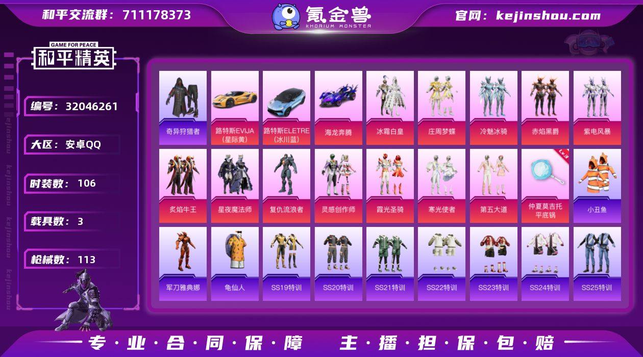 安卓 手Q-12粉装-1特效枪-3载具-40803热力值-1印记-106套装-113枪皮 【稀有载具】:路特斯EVIJA(星际黄),路特斯ELETRE(冰川蓝),海龙奔腾 【特效枪等级】:平底锅-仲夏莫吉托(三级) 【优质套装】:粉装-冰霜白皇,粉装-庄周梦蝶,粉装-冷魅冰骑,粉装-赤焰黑爵,粉装-紫电风暴,粉装-炙焰牛王,粉装-星夜魔法师,角色-复仇流浪者,粉装-灵感创作师,粉装-霞光圣骑,粉装-寒光使者,粉装-第五大道 【稀有套装】:套装-龟仙人 【优质武器皮肤】:平底锅-仲夏莫吉托 【稀有武器皮肤】:AKM-彩虹符号,AKM-灼热熔岩,AKM-缤纷海域,AKM-龙的传人,M16A4-幻世战舞者,M16A4-甜心亚梦,SCAR-L-玉兔迎春,SCAR-L-红色方程式,M416-月影鸳鸯,M416-糯团青竹,M416-紫翼圣骑,M416-蓝色火焰,GROZA-彩虹符号,GROZA-恐龙拽拽,GROZA-懵萌河马,GROZA-春暖花开,GROZA-田园牧歌,GROZA-紫翼圣骑,AUG-圣光天使,AUG-天降萌叽,AUG-幻影战神,QBZ-未来歌姬,QBZ-飞驰魅影,M762-天降萌叽,Mk47-妙红点点,G36C-冷魅冰骑,G36C-懵萌河马,AC-VAL-天降萌叽,AC-VAL-彩虹甜喵,AC-VAL-甜心亚梦,AC-VAL-闲梦青缨,蜜獾-天降萌叽,蜜獾-娇憨猪猪,UZI-娇憨猪猪,UZI-幻影战神,UZI-红色方程式,UMP45-炫光之旅,UMP45-蓝色火焰,Vector-田园牧歌,汤姆逊-天降萌叽,汤姆逊-幻影战神,汤姆逊-庄周梦蝶,汤姆逊-环太平洋,汤姆逊-甜梦小狐,汤姆逊-耀粉歌者,MP5K-飒粉甜心,P90-飞驰魅影,Kar98K-飞驰魅影,AWM-垂柳戏鸭,SKS-炫彩节奏,VSS-田园牧歌,Mini14-星夜魔法师,Mini14-炫彩节奏,Mk14-童趣迷兔,SLR-娇憨猪猪,SLR-月影鸳鸯,QBU-飒粉甜心,莫辛纳甘-懵萌河马,莫辛纳甘-炙焰牛王,AMR-妙红点点,M417-惊鸿侠骨,M200-仲夏莫吉托,M200-惊鸿侠骨,S686-王牌投手,S1897-星夜魔法师,S1897-炫彩节奏,S1897-飞驰魅...