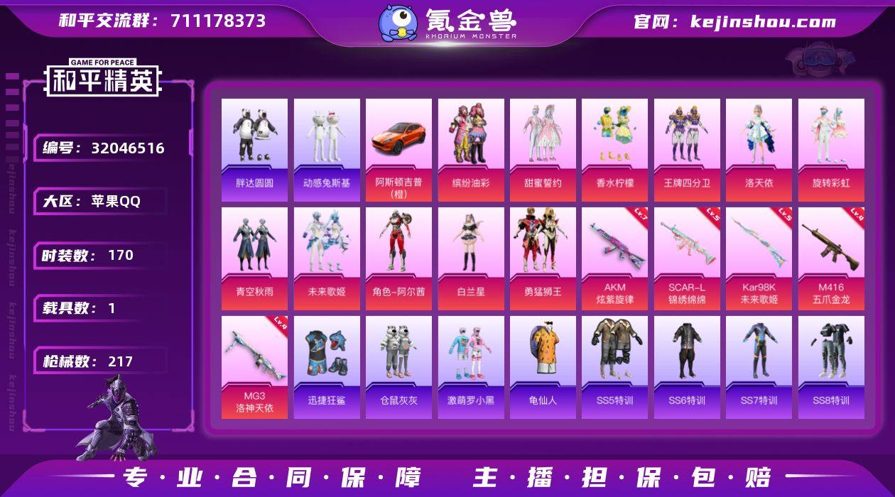 苹果 手Q-11粉装-5特效枪-1载具-75577热力值-10印记-170套装-217枪皮 【稀有载具】:阿斯顿马丁DBX(橙) 【特效枪等级】:AKM-炫紫旋律(七级),SCAR-L-锦绣绵绵(五级),M416-五爪金龙(四级),Kar98K-未来歌姬(五级),MG3-洛神天依(四级) 【优质套装】:粉装-缤纷油彩,粉装-甜蜜誓约,粉装-香水柠檬,粉装-王牌四分卫,角色-洛天依,粉装-旋转彩虹,粉装-青空秋雨,粉装-未来歌姬,角色-阿尔茜,角色-白兰星,粉装-勇猛狮王 【稀有套装】:套装-龟仙人 【优质武器皮肤】:AKM-炫紫旋律,SCAR-L-锦绣绵绵,M416-五爪金龙,Kar98K-未来歌姬,MG3-洛神天依 【稀有武器皮肤】:AKM-夜灯,AKM-彩虹符号,AKM-灼热熔岩,AKM-玉龙,AKM-缤纷海域,AKM-霓虹街区,AKM-龙的传人,M16A4-夜灯,M16A4-幻世战舞者,M16A4-机械英豪,M16A4-甜心亚梦,M16A4-蓝色火焰,SCAR-L-炫彩节奏,SCAR-L-玉兔迎春,SCAR-L-雷霆特警,SCAR-L-黄金龙骨,M416-夜灯,M416-神秘黑猫,M416-糯团青竹,M416-红色方程式,M416-蓝色火焰,GROZA-懵萌河马,GROZA-治愈之星,GROZA-生命誓言,GROZA-田园牧歌,GROZA-黑色刀锋,AUG-天降萌叽,AUG-耀粉歌者,QBZ-原初圣火,QBZ-洛神天依,M762-天降萌叽,M762-拳皇97,M762-牛气冲天,M762-镭射皇者,Mk47-妙红点点,Mk47-洛神天依,Mk47-炫光之旅,G36C-不夜海上花,G36C-懵萌河马,AC-VAL-天降萌叽,AC-VAL-快闪甜心,AC-VAL-甜心亚梦,AC-VAL-魅影蝠王,蜜獾-天降萌叽,蜜獾-娇憨猪猪,UZI-众神之王,UZI-啾咪啾咪,UZI-天降萌叽,UZI-娇憨猪猪,UZI-红色方程式,UMP45-夜灯,UMP45-涂山之恋,UMP45-炫光之旅,Vector-焰鹰斗篷,Vector-治愈之星,Vector-生命誓言,Vector-田园牧歌,Vector-香水柠檬,Vector-黑色刀锋,汤姆逊-勇闯险境,汤姆逊-天降萌叽,汤姆逊-奇异狩猎者,汤姆逊-诡面斩,汤...