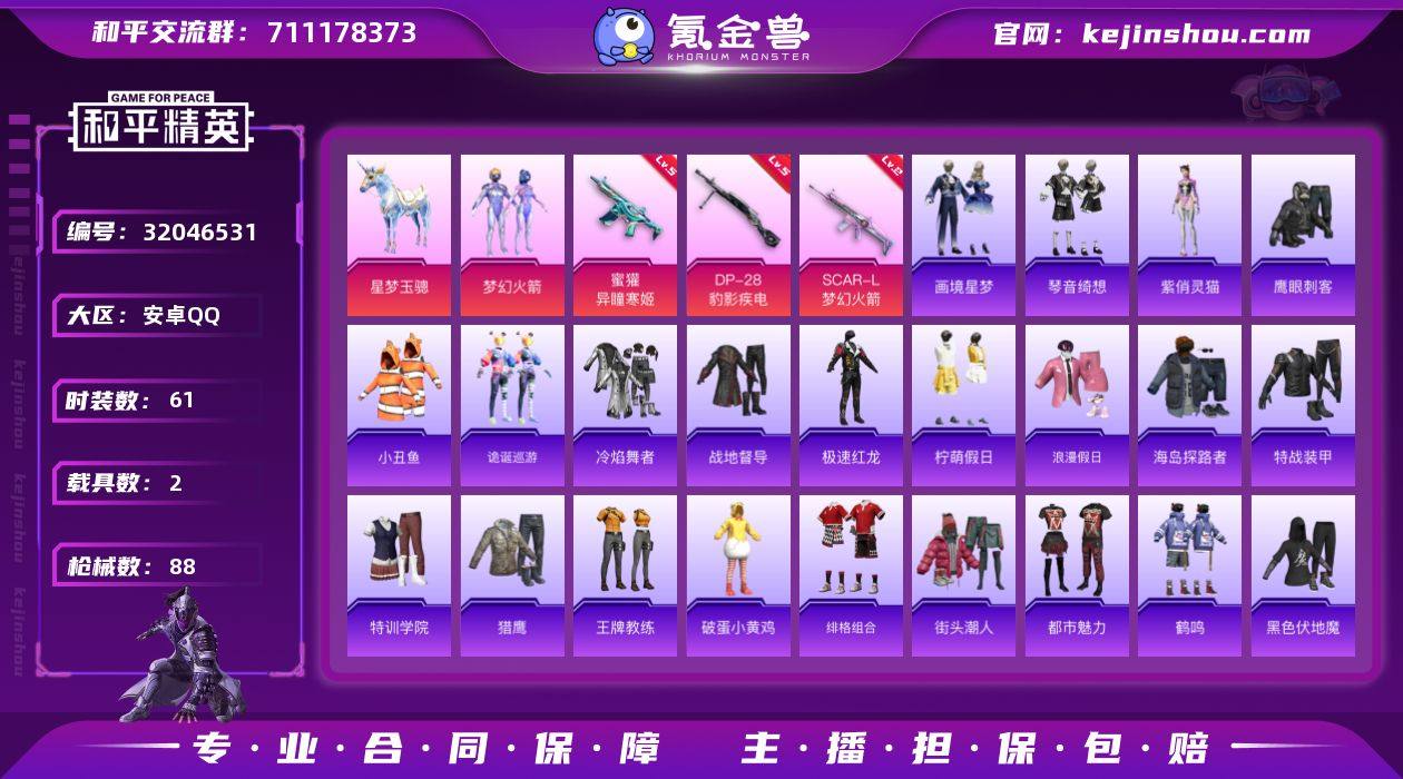安卓 手Q-2粉装-5特效枪-2载具-3粉色飞行器-24054热力值-3王牌印记-61套装-88枪皮 【热门品类】:粉装-梦幻火箭,套装-小丑鱼 【粉色套装】:粉装-梦幻火箭,角色-虎痴许褚 【粉色枪皮等级】:SCAR-L-梦幻火箭(二级),蜜獾-异瞳寒姬(五级),UMP45-萌骑冒险(三级),Mk14-福马献瑞(四级),DP-28-豹影疾电(五级) 【粉色载具】:星梦玉骢,暮色幽蹄 【粉色枪皮】:SCAR-L-梦幻火箭,蜜獾-异瞳寒姬,UMP45-萌骑冒险,Mk14-福马献瑞,DP-28-豹影疾电 【粉色飞行器】:炫彩糖果飞行器,梦幻火箭飞行器,暮色之舞飞行器 【粉色降落伞】:梦幻火箭降落伞,星梦奇缘降落伞,异瞳寒姬降落伞,炫彩糖果降落伞,暮色玫影降落伞 【稀有套装】:套装-雪国风尚,套装-炫彩糖果,套装-彩虹骑师,套装-马上有钱,套装-诡诞巡游,角色-紫俏灵猫,套装-画境星梦,套装-琴音绮想,套装-雨过天青,套装-红釉青花,角色-唐三,角色-朱竹清 【稀有枪皮】:AUG-冰晶雪宝,AKM-影袭,AKM-星之彼岸,SCAR-L-夜灯,SCAR-L-炫彩节奏,GROZA-影袭,GROZA-暮色玫影,QBZ-洛神天依,M762-天降萌叽,M762-甜心宝贝,蜜獾-虎痴许褚,ACE32-画境星梦,UZI-天降萌叽,UZI-影袭,UMP45-夜灯,UMP45-极意拳锋,Vector-生命誓言,汤姆逊-天降萌叽,汤姆逊-环太平洋,MP5K-画境星梦,AKS-74U-荧光像素,Kar98K-影袭,M24-影袭,AWM-暮色玫影,Mini14-梦幻火箭,AMR-喜羊羊与灰太狼,M1加兰德-千仞雪,M1加兰德-画境星梦,S686-生命誓言,S1897-炫彩节奏,S12K-夜灯,AA12-G-画境星梦,M249-彩虹符号,MG3-幻世战舞者,PKM-荧光像素,突击盾牌-绝对恒星,撬棍-暮色玫影,平底锅-画境星梦 【其他套装】:套装-冷焰舞者,套装-战地督导,套装-极速红龙,套装-柠萌假日,套装-浪漫假日,套装-海岛探路者,套装-特战装甲,套装-特训学院,套装-猎鹰,套装-王牌教...