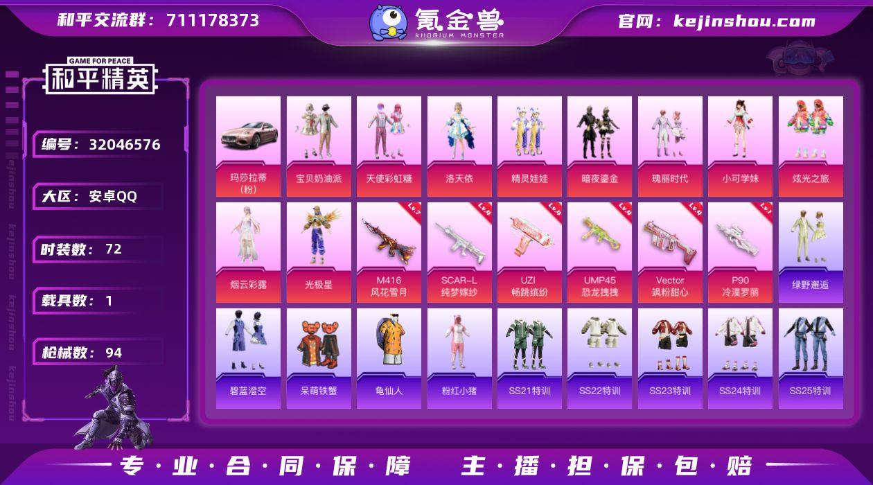 J1159 精品 12粉 6特 1载具 宝贝奶油派 天使彩虹糖 小可学妹 洛天依 光极星 炫光之旅 精灵娃娃 满级心之恋语 安卓 手Q-12粉装-6特效枪-1载具-1粉色飞行器-35668热力值-4王牌印记-72套装-94枪皮 【热门品类】:套装-龟仙人,套装-粉红小猪 【粉色套装】:粉装-宝贝奶油派,粉装-天使彩虹糖,角色-洛天依,粉装-精灵娃娃,粉装-暗夜鎏金,粉装-瑰丽时代,粉装-绿野邂逅,粉装-碧蓝澄空,角色-小可学妹,粉装-炫光之旅,角色-烟云彩露,角色-光极星 【粉色枪皮等级】:SCAR-L-纯梦嫁纱(四级),M416-风花雪月(七级),UZI-畅跳缤纷(四级),UMP45-恐龙拽拽(四级),Vector-飒粉甜心(四级),P90-冷漠罗丽(一级) 【粉色载具】:玛莎拉蒂Ghibli(粉) 【粉色枪皮】:SCAR-L-纯梦嫁纱,M416-风花雪月,UZI-畅跳缤纷,UMP45-恐龙拽拽,Vector-飒粉甜心,P90-冷漠罗丽 【粉色飞行器】:圣光天使飞行器 【粉色降落伞】:甜心宝贝降落伞,甜心娃娃降落伞,恐龙拽拽降落伞,旋转彩虹降落伞,畅跳缤纷降落伞,梦幻舞会降落伞,飒粉甜心降落伞,白勺歌姬降落伞,闲梦青缨降落伞,炫光之旅降落伞,猪猪侠降落伞,江南烟雨降落伞 【稀有套装】:套装-龟仙人 【稀有枪皮】:AKM-2P战斗服款,AKM-彩虹符号,AKM-恐龙拽拽,AKM-星之彼岸,AKM-江南烟雨,AKM-破晓战魂,AKM-缤纷海域,AKM-龙的传人,M16A4-蓝色火焰,SCAR-L-甜蜜旋律,M416-红色方程式,GROZA-恐龙拽拽,GROZA-懵萌河马,GROZA-田园牧歌,AUG-天降萌叽,AUG-耀粉歌者,M762-天降萌叽,M762-甜心宝贝,Mk47-妙红点点,Mk47-炫光之旅,G36C-懵萌河马,AC-VAL-闲梦青缨,蜜獾-天降萌叽,蜜獾-娇憨猪猪,UZI-天降萌叽,UZI-娇憨猪猪,UZI-炫彩节奏,UMP45-涂山之恋,UMP45-炫光之旅,UMP45-生命誓言,Vector-焰鹰斗篷,Vector-田园牧歌,汤姆逊-天降萌叽,P90-倾城蜜语,P90-...