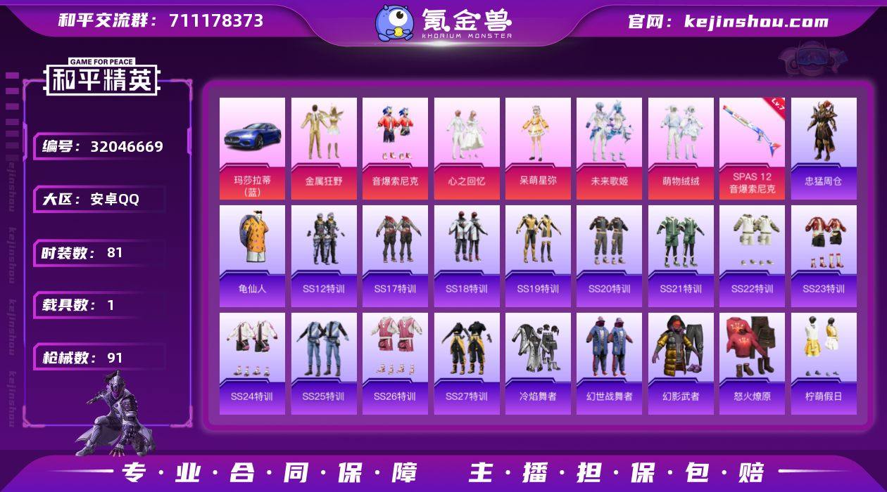 安卓 手Q-6粉装-1特效枪-1载具-29920热力值-3印记-81套装-91枪皮 【稀有载具】:玛莎拉蒂Ghibli(蓝) 【特效枪等级】:SPAS-12-音爆索尼克(七级) 【优质套装】:粉装-金属狂野,粉装-音爆索尼克,粉装-心之回忆,角色-呆萌星弥,粉装-未来歌姬,粉装-萌物绒绒 【稀有套装】:套装-龟仙人 【优质武器皮肤】:SPAS-12-音爆索尼克 【稀有武器皮肤】:AKM-彩虹符号,AKM-破晓战魂,AKM-萌趣颜团子,AKM-龙的传人,M16A4-幻世战舞者,SCAR-L-炫彩节奏,SCAR-L-玉兔迎春,SCAR-L-红色方程式,M416-糯团青竹,M416-红色方程式,M416-绯红前夜,M416-蓝色火焰,GROZA-彩虹符号,AUG-天降萌叽,AUG-耀粉歌者,QBZ-洛神天依,M762-天降萌叽,M762-绯红前夜,M762-萌物绒绒,AC-VAL-天降萌叽,AC-VAL-闲梦青缨,蜜獾-天降萌叽,UZI-天降萌叽,UZI-红色方程式,UMP45-炫光之旅,UMP45-生命誓言,UMP45-蓝色火焰,Vector-生命誓言,Vector-音爆索尼克,汤姆逊-耀粉歌者,野牛-粉锦千层,MP5K-彩虹嘻嘻猴,MP5K-甜蜜誓约,MP5K-飒粉甜心,Kar98K-红色方程式,M24-炫彩节奏,AWM-音爆索尼克,VSS-碧影闪光,Mini14-春暖花开,Mini14-耀粉歌者,莫辛纳甘-银碳小老虎,AMR-白勺歌姬,M417-惊鸿侠骨,MK20-H-莲影清波,M200-惊鸿侠骨,S686-生命誓言,S686-红色方程式,S1897-炫彩节奏,S1897-碧影闪光,S12K-玩趣呆呆,S12K-破晓战魂,S12K-音爆索尼克,S12K-幻世战舞者,DBS-圣堂之誓,DBS-第五大道,M249-彩虹符号,M249-破晓战魂,M249-糯团青竹,DP-28-彩虹符号,DP-28-锦绣火鲤,MG3-幻世战舞者,MG3-惊鸿侠骨,P1911-粉锦千层,TMP-9-未来歌姬,爆炸猎弓-惊鸿侠骨,大砍刀-青龙偃月刀,平底锅-绝色倾城 【热门品类】:角色-忠猛周仓,大砍刀-青龙偃月刀,撬棍-龙胆亮银枪 【其他套装】:套装-SS12特训,套装-SS17特训,套装-...
