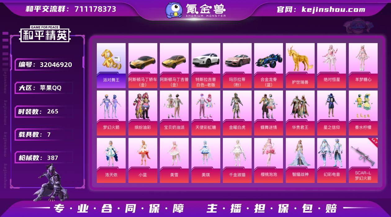 J2404 【精品无敌战神女号】19粉 24特 7载 金鞋 红熊茄茄 阳光菠萝 樱桃泡泡 羊梦糖心 恒星 幻彩电音 缤纷油彩 梦幻火箭 蝶舞迷情 宝贝奶油派 天使彩虹糖 洛天依 智耀战神 满级枪*12 苹果 手Q-无敌战神框-19粉装-24特效枪-7载具-10粉色飞行器-147442热力值-26王牌印记-265套装-387枪皮 【热门品类】:粉装-梦幻火箭,粉装-缤纷油彩,套装-派对舞王,套装-龟仙人,套装-红熊茄茄 【粉色套装】:角色-绝对恒星,粉装-宝贝奶油派,粉装-天使彩虹糖,粉装-金曜白虎,粉装-蝶舞迷情,粉装-梦幻火箭,粉装-华贵君王,粉装-星之信仰,粉装-缤纷油彩,粉装-香水柠檬,角色-洛天依,角色-小蓝,角色-美雪,角色-美琪,角色-千金淑猫,角色-樱桃泡泡,角色-智耀战神,粉装-幻彩电音,角色-羊梦糖心 【粉色枪皮等级】:AKM-炫紫旋律(五级),SCAR-L-梦幻火箭(七级),M416-五爪金龙(七级),M416-心之恋语(一级),GROZA-巴啦啦小魔仙(七级),AUG-暖羊咩咩(五级),M762-甜蜜誓约(七级),汤姆逊-热量炸弹(五级),AKS-74U-星穹咏叹调(六级),AKS-74U-森灵之息(五级),Kar98K-伏魔团(四级),Kar98K-巳巳如意(五级),M24-星之信仰(五级),Mini14-龙虾霸霸(四级),Mk14-盛世惊鸿(三级),Mk14-樱桃泡泡(一级),Mk14-甜梦熊击(五级),M249-绝对恒星(五级),DP-28-扶摇飞仙(五级),DP-28-豹影疾电(五级),MG3-洛神天依(七级),PKM-江南烟雨(七级),MG-36-沧焰双生(五级),平底锅-喜羊羊与灰太狼(六级) 【粉色载具】:特斯拉Model X(珍珠白),阿斯顿马丁DBS(金),阿斯顿马丁DBX(金),玛莎拉蒂Ghibli(粉),合金龙骨(蓝),僚机-冰龙团团,护世瑞兽,暮色幽蹄 【粉色枪皮】:AKM-炫紫旋律,SCAR-L-梦幻火箭,M416-五爪金龙,M416-心之恋语,GROZA-巴啦啦小魔仙,AUG-暖羊咩咩,M762-甜蜜誓约,汤姆逊-热量炸弹,AKS-74U-星穹咏叹调...