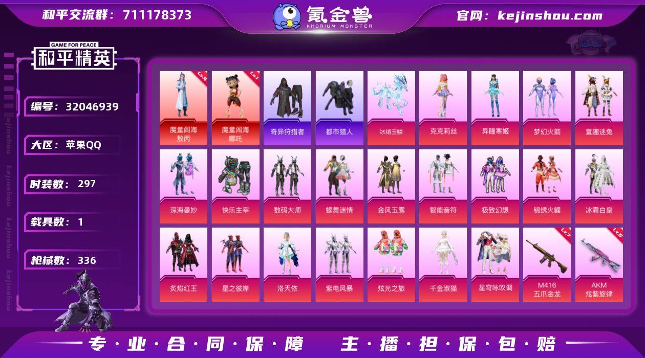 J1607 精品 3红 20粉 9特 1载具 4级红 暮色玫影 敖丙 哪吒 都市猎人 奇异狩猎者 狂沙舞者 浪漫天命 洛天依 千金淑猫 智能音符 星之彼岸 小丑鱼 苹果 手Q-3神装-20粉装-9特效枪-1载具-7粉色飞行器-124353热力值-22王牌印记-297套装-336枪皮 【红色神装等级】:暮色玫影-艾丽娅(一级),魔童闹海-敖丙(四级),魔童闹海-哪吒(一级) 【红色角色神装】:暮色玫影-艾丽娅,魔童闹海-敖丙,魔童闹海-哪吒 【热门品类】:粉装-梦幻火箭,粉装-童趣迷兔,套装-浪漫天命,套装-都市猎人,套装-小丑鱼,套装-奇异狩猎者,套装-金羽特工,套装-SS1特训,旭日初心兜帽大衣,套装-龟仙人,套装-暗影哥特,套装-粉红小猪,熔岩游骑兵连帽夹克 【粉色套装】:粉装-深海曼妙,角色-克克莉丝,粉装-快乐主宰,粉装-数码大师,粉装-蝶舞迷情,粉装-梦幻火箭,粉装-金风玉露,粉装-智能音符,粉装-极致幻想,粉装-锦绣火鲤,粉装-冰霜白皇,粉装-童趣迷兔,粉装-炙焰红王,粉装-星之彼岸,角色-洛天依,粉装-紫电风暴,粉装-炫光之旅,角色-千金淑猫,粉装-星穹咏叹调,角色-异瞳寒姬 【粉色枪皮等级】:AKM-炫紫旋律(六级),SCAR-L-梦幻火箭(一级),SCAR-L-魔童闹海 哪吒(三级),M416-五爪金龙(七级),M416-心之恋语(一级),M762-冷魅冰骑(五级),DP-28-豹影疾电(五级),MG3-洛神天依(五级),MG-36-沧焰双生(四级) 【粉色载具】:冰绡玉鳞 【粉色枪皮】:AKM-炫紫旋律,SCAR-L-梦幻火箭,SCAR-L-魔童闹海 哪吒,M416-五爪金龙,M416-心之恋语,M762-冷魅冰骑,DP-28-豹影疾电,MG3-洛神天依,MG-36-沧焰双生 【粉色飞行器】:梦幻火箭飞行器,古堡领主飞行器,锦绣火鲤飞行器,童趣迷兔飞行器,飞天猪飞行器,灵珠游龙飞行器 【粉色降落伞】:深海曼妙降落伞,快乐主宰降落伞,百万伏特降落伞,至尊龙雀降落伞,春暖花开降落伞,精灵...