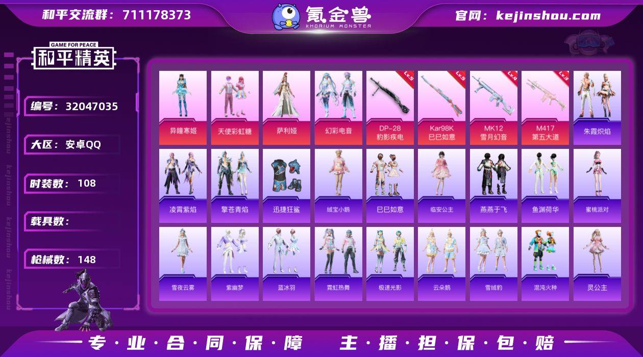 安卓 手Q-4粉装-5特效枪-0载具-2粉色飞行器-39942热力值-3王牌印记-108套装-148枪皮 【粉色套装】:粉装-天使彩虹糖,角色-萨利娅,粉装-幻彩电音,角色-异瞳寒姬 【粉色枪皮等级】:ACE32-萌骑漫游(五级),Kar98K-巳巳如意(五级),M417-第五大道(三级),MK12-雪月幻音(四级),DP-28-豹影疾电(五级) 【粉色枪皮】:ACE32-萌骑漫游,Kar98K-巳巳如意,M417-第五大道,MK12-雪月幻音,DP-28-豹影疾电 【粉色飞行器】:炫彩糖果飞行器,春暖花开飞行器 【粉色降落伞】:春暖花开降落伞,第五大道降落伞,白勺歌姬降落伞,蜜语绒猫降落伞,星月云朵降落伞,雪月幻音降落伞,幻彩电音降落伞,炫彩糖果降落伞 【稀有套装】:套装-绒宝小鹅,套装-巳巳如意,套装-雪国风尚,套装-炫彩糖果,套装-马上有钱,角色-临安公主,套装-燕燕于飞,套装-鱼渊荷华,角色-蜜桃派对,套装-雪夜云雾,套装-紫幽梦,套装-蓝冰羽,套装-霓虹热舞,套装-极速光影,套装-云朵鹅,套装-雪绒豹,套装-混沌火种,角色-灵公主,套装-朱霞炽焰,套装-凌霄紫焰,套装-擎苍青焰,套装-红釉青花 【稀有枪皮】:AUG-冰晶雪宝,AKM-夜灯,AKM-破晓战魂,AKM-萌趣颜团子,AKM-虎虎生威,AKM-星月云朵,M16A4-幻世战舞者,M16A4-蓝色火焰,M16A4-千金淑猫,SCAR-L-玉兔迎春,SCAR-L-红色方程式,M416-夜灯,M416-蓝色火焰,GROZA-彩虹符号,AUG-天降萌叽,AUG-甜蜜菠萝,AUG-耀粉歌者,QBZ-彩虹符号,M762-彩虹甜喵,M762-瑞龙福将,M762-第五大道,M762-云朵鹅,G36C-桃粉嫣然,AC-VAL-天降萌叽,AC-VAL-彩虹甜喵,蜜獾-娇憨猪猪,蜜獾-御兔特攻,ARX-凌霄紫焰,UZI-娇憨猪猪,UZI-炫彩节奏,UZI-红色方程式,UMP45-海渊国主,UMP45-生命誓言,UMP45-蓝色火焰,Vector-彩虹符号,Vector-生命誓言,汤姆逊-耀粉歌者,JS9-凌霄紫焰,P90-巳巳如意,Kar98...