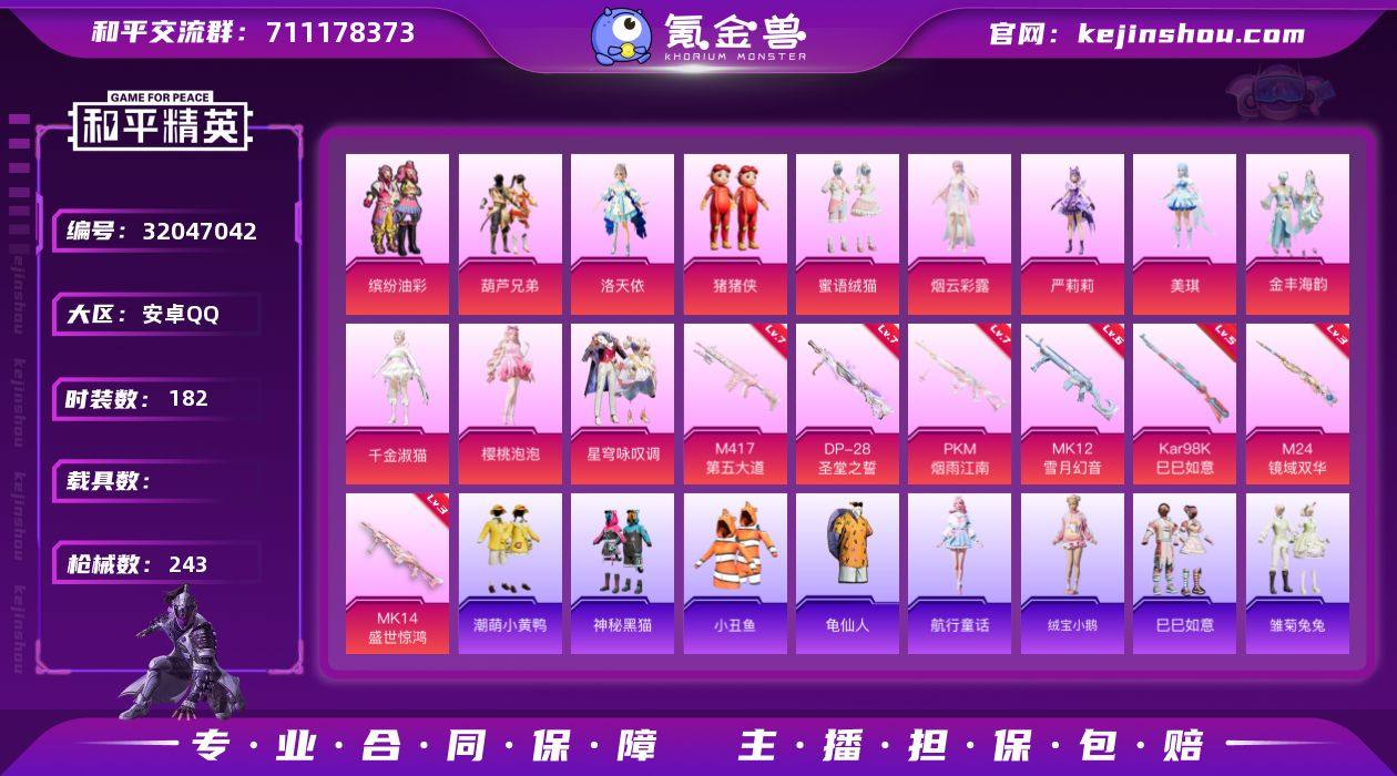 安卓 手Q-13粉装-7特效枪-0载具-85888热力值-7印记-182套装-243枪皮 【特效枪等级】:Kar98K-巳巳如意(五级),M24-镜域双华(三级),Mk14-盛世惊鸿(三级),M417-第五大道(七级),MK12-雪月幻音(六级),DP-28-圣堂之誓(七级),PKM-江南烟雨(七级) 【优质套装】:粉装-缤纷油彩,粉装-葫芦兄弟,角色-洛天依,玩偶服-猪猪侠,粉装-蜜语绒猫,角色-烟云彩露,角色-严莉莉,角色-美琪,粉装-金丰海韵,角色-千金淑猫,角色-樱桃泡泡,粉装-星穹咏叹调 【稀有套装】:套装-龟仙人,套装-航行童话,套装-绒宝小鹅,套装-巳巳如意,套装-雏菊兔兔,套装-萝兰蝴蝶,套装-火种守卫者,套装-糖糖葫芦,套装-青团波波,套装-棉花软糖,角色-都市丽猫,角色-摩登魅猫,角色-俏兔智灵,套装-燕燕于飞,套装-鱼渊荷华,角色-风玲,套装-晶辉守护,角色-蜜桃派对,套装-粉恋花,套装-紫幽梦,套装-蓝冰羽,角色-瑰梦爱神,套装-星渊小夜曲,套装-极速光影,套装-云朵鹅,套装-雪绒豹 【优质武器皮肤】:Kar98K-巳巳如意,M24-镜域双华,Mk14-盛世惊鸿,M417-第五大道,MK12-雪月幻音,DP-28-圣堂之誓,PKM-江南烟雨 【稀有武器皮肤】:AKM-四圣焕新,AKM-夜灯,AKM-彩虹符号,AKM-恐龙拽拽,AKM-江南烟雨,AKM-灼热熔岩,AKM-生命誓言,AKM-萌趣颜团子,AKM-虎虎生威,AKM-霓虹街区,M16A4-幻世战舞者,M16A4-千金淑猫,SCAR-L-红色方程式,M416-糯团青竹,M416-红色方程式,M416-绯红前夜,M416-蓝色火焰,GROZA-彩虹符号,GROZA-春暖花开,AUG-天降萌叽,AUG-耀粉歌者,AUG-闲梦青缨,AUG-月影灵韵,QBZ-洛神天依,QBZ-神秘黑猫,QBZ-飞驰魅影,M762-天降萌叽,M762-牛气冲天,M762-瑞龙福将,M762-第五大道,M762-绯红前夜,M762-云朵鹅,G36C-镜域双华,G36C-星穹咏叹调,AC-VAL-天降萌叽,AC-VAL-快闪甜心,蜜獾-天降萌叽,Fa...