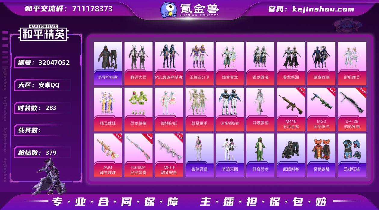安卓 手Q-14粉装-6特效枪-0载具-1粉色飞行器-115373热力值-6王牌印记-283套装-379枪皮 【热门品类】:套装-小丑鱼,套装-奇异狩猎者,套装-龟仙人,套装-暗影哥特,角色-Mark.06,小恶魔头饰 【粉色套装】:粉装-数码大师,粉装-PEL轰鸣竞梦者,粉装-王牌四分卫,粉装-绮梦青鸾,粉装-银龙傲海,粉装-骨龙祭渊,粉装-暗夜玫瑰,粉装-彩虹鹿灵,粉装-精灵娃娃,粉装-恐龙拽拽,粉装-旋转彩虹,粉装-射星猎手,粉装-未来领航者,角色-冷漠罗丽 【粉色枪皮等级】:M416-五爪金龙(七级),AUG-暖羊咩咩(五级),Kar98K-巳巳如意(五级),Mk14-甜梦熊击(五级),DP-28-豹影疾电(五级),MG3-突变脉冲(七级) 【粉色枪皮】:M416-五爪金龙,AUG-暖羊咩咩,Kar98K-巳巳如意,Mk14-甜梦熊击,DP-28-豹影疾电,MG3-突变脉冲 【粉色飞行器】:英伦信使飞行器 【粉色降落伞】:甜心宝贝降落伞,精灵迷巫降落伞,天启纪元降落伞,龙虾霸霸降落伞,炫紫旋律降落伞,神秘黑猫降落伞,古堡领主降落伞,阿狸红降落伞,银刃赛罗降落伞,相思残雪降落伞,洛神天依降落伞,海渊国主降落伞,蓝莓炮弹降落伞,环太平洋降落伞,暗夜鎏金降落伞,闲梦青缨降落伞,炫光之旅降落伞,霓虹漫游降落伞,忍者神龟降落伞,脆鲨七海降落伞,月下星之子降落伞,幻彩电音降落伞,绯穹魔姬降落伞 【稀有套装】:套装-龟仙人,套装-巳巳如意,套装-雏菊兔兔,套装-萝兰蝴蝶,套装-糖糖葫芦,套装-青团波波,角色-都市丽猫,角色-怀庆长公主,套装-燕燕于飞,套装-鱼渊荷华,套装-萌萌史莱姆,套装-紫幽梦,套装-蓝冰羽,角色-瑰梦爱神,套装-云朵鹅,套装-雪绒豹,套装-蜜露汐语,角色-紫俏灵猫 【稀有枪皮】:AKM-冰凉西瓜,AKM-夜灯,AKM-彩虹符号,AKM-灼热熔岩,AKM-玉龙,AKM-生命誓言,AKM-破晓战魂,AKM-萌趣颜团子,AKM-虎虎生威,AKM-霓虹街区,AKM...