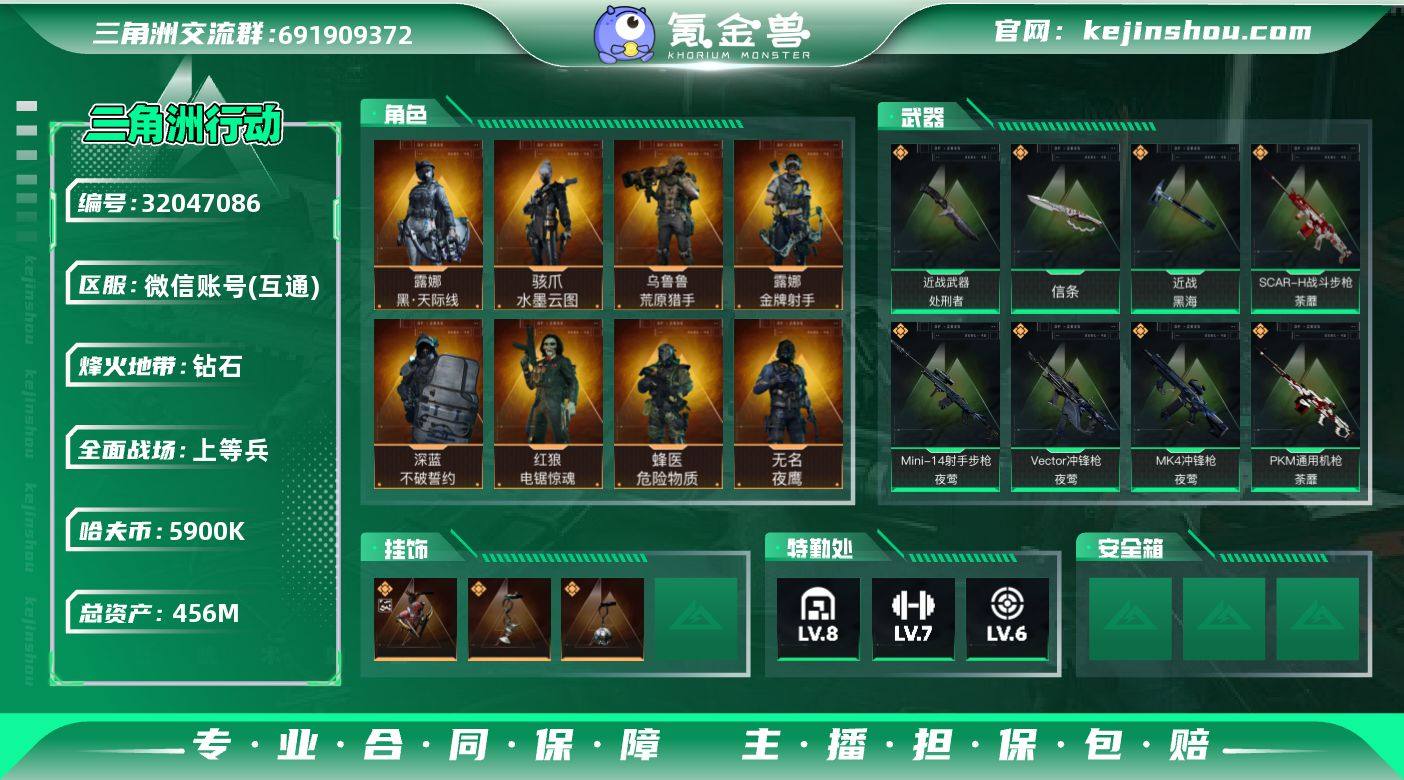 实名:可二次实名 总资产:456M 哈夫币:5900K 烽火地带段位:钻石 烽火地带等级:60 全面战场段位:上等兵 8级仓库,7级训练中心,6级靶场,3级潜水中心,1级收藏室 战术部门等级:2 战斗部门等级:3 医疗部门等级:3 研发部门等级:2 后勤部门等级:3