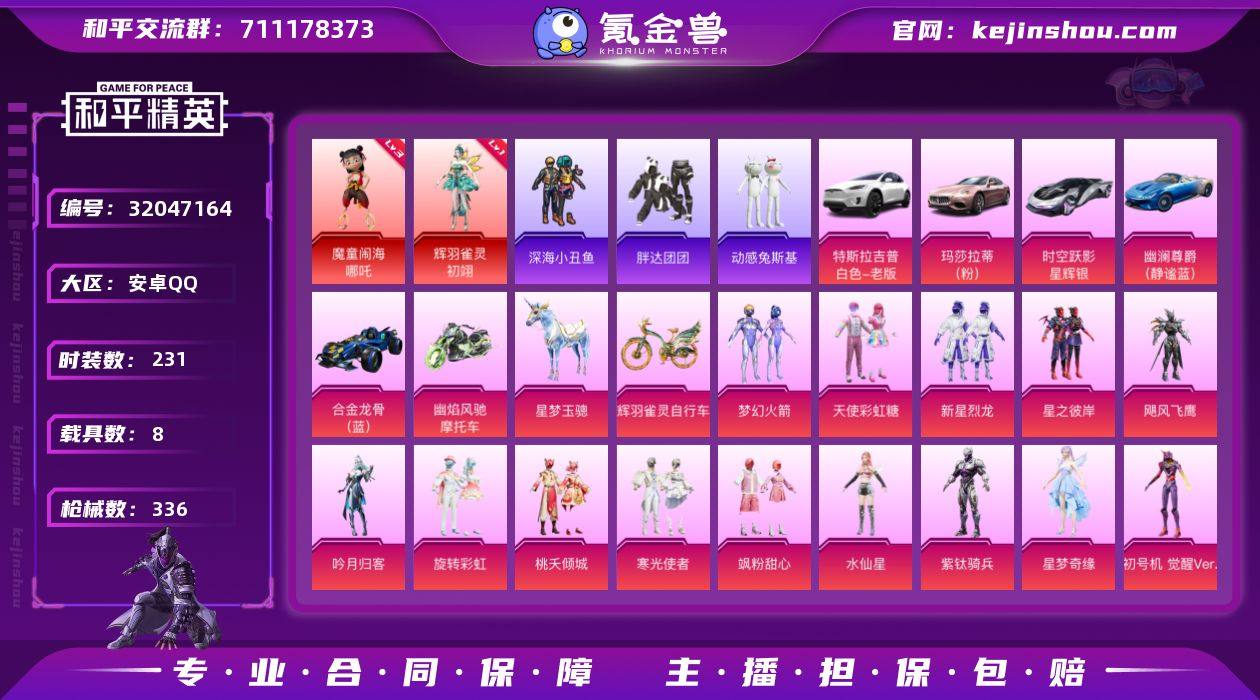 安卓 手Q-2神装-20粉装-16特效枪-8载具-15粉色飞行器-117766热力值-14王牌印记-231套装-336枪皮 【红色神装等级】:魔童闹海-哪吒(三级),辉羽雀灵-初翊(一级) 【红色角色神装】:魔童闹海-哪吒,辉羽雀灵-初翊 【热门品类】:粉装-梦幻火箭,套装-浪漫天命,套装-深海小丑鱼,套装-胖达团团,套装-动感兔斯基人偶服,套装-SS1特训,套装-龟仙人,套装-暗影哥特,套装-粉红小猪,角色-8号机,角色-Mark.06,熔岩游骑兵连帽夹克 【粉色套装】:粉装-天使彩虹糖,粉装-梦幻火箭,粉装-新星烈龙,粉装-星之彼岸,粉装-飓风飞鹰,粉装-吟月归客,粉装-旋转彩虹,粉装-桃夭倾城,粉装-寒光使者,粉装-飒粉甜心,角色-水仙星,角色-紫钛骑兵,角色-星梦奇缘,角色-初号机 觉醒Ver.,粉装-金丰海韵,角色-女娲灵识,角色-智耀战神,角色-狂魅哈莉,角色-绯月迷踪,角色-荧海星豚 【粉色枪皮等级】:AKM-星际浪客(七级),M16A4-垂柳戏鸭(二级),SCAR-L-梦幻火箭(五级),M416-至情至圣(九级),GROZA-精灵之光(一级),UMP45-启明星(六级),UMP45-宇宙意志(三级),Vector-最终圣卫者(二级),P90-沙丘之主(二级),Kar98K-巳巳如意(五级),SPAS-12-音爆索尼克(一级),DP-28-暗夜鎏金(二级),DP-28-豹影疾电(四级),MG3-辉羽雀灵(二级),烟雾弹-电雾迷城(四级),破片手榴弹-美味星星糖(六级) 【粉色载具】:特斯拉Model X(珍珠白),玛莎拉蒂Ghibli(粉),时空跃影(星辉银),幽澜尊爵(静谧蓝),合金龙骨(蓝),幽焰风驰摩托车,星梦玉骢,辉羽雀灵自行车 【粉色枪皮】:AKM-星际浪客,M16A4-垂柳戏鸭,SCAR-L-梦幻火箭,M416-至情至圣,GROZA-精灵之光,UMP45-启明星,UMP45-宇宙意志,Vector-最终圣卫者,P90-沙丘之主,Kar98K-巳巳如意,SPAS-12-音爆索尼克,DP-28-暗夜鎏金,DP-28-豹影疾电,MG3-辉羽雀灵,烟雾弹-电...