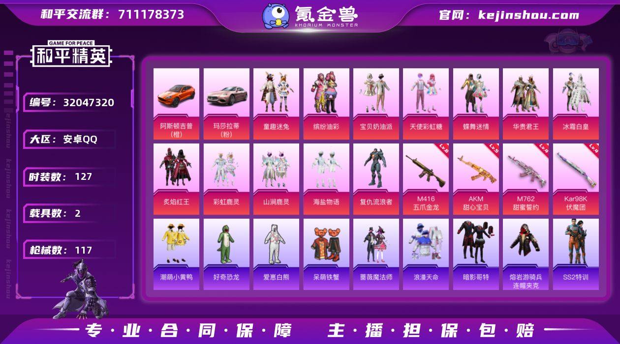安卓 手Q-12粉装-4特效枪-2载具-2粉色飞行器-47944热力值-3王牌印记-127套装-117枪皮 【热门品类】:粉装-童趣迷兔,粉装-缤纷油彩,套装-浪漫天命,套装-SS1特训,套装-潮萌小黄鸭,套装-暗影哥特,小恶魔头饰,熔岩游骑兵面罩,熔岩游骑兵连帽夹克 【粉色载具】:阿斯顿马丁DBX(橙),玛莎拉蒂Ghibli(粉) 【粉色套装】:粉装-宝贝奶油派,粉装-天使彩虹糖,粉装-蝶舞迷情,粉装-华贵君王,粉装-缤纷油彩,粉装-冰霜白皇,粉装-童趣迷兔,粉装-炙焰红王,粉装-彩虹鹿灵,粉装-山涧鹿灵,粉装-海盐物语,角色-复仇流浪者 【粉色枪皮等级】:AKM-甜心宝贝(五级),M416-五爪金龙(六级),M762-甜蜜誓约(四级),Kar98K-伏魔团(四级) 【粉色枪皮】:AKM-甜心宝贝,M416-五爪金龙,M762-甜蜜誓约,Kar98K-伏魔团 【粉色飞行器】:春暖花开飞行器,童趣迷兔飞行器 【粉色降落伞】:凝视深渊降落伞,甜心宝贝降落伞,至尊龙雀降落伞,春暖花开降落伞,精灵迷巫降落伞,梦幻火箭降落伞,古堡领主降落伞,甜蜜誓约降落伞,锦绣火鲤降落伞,童趣迷兔降落伞,橘柚倾心降落伞,环太平洋降落伞,垂柳戏鸭降落伞 【稀有枪皮】:AKM-春暖花开,AKM-灼热熔岩,AKM-霓虹街区,AKM-龙的传人,M16A4-凝视深渊,M16A4-机械英豪,M16A4-生命誓言,M16A4-魔法学院,SCAR-L-凝视深渊,SCAR-L-甜蜜誓约,M416-夜灯,M416-蓝色火焰,M416-魔法学院,GROZA-春暖花开,GROZA-黑色刀锋,AUG-凝视深渊,AUG-天降萌叽,AUG-耀粉歌者,AUG-魔法学院,M762-天降萌叽,M762-奇异狩猎者,M762-拳皇97,M762-甜心宝贝,M762-镭射皇者,Mk47-林间仙鹿,G36C-不夜海上花,蜜獾-娇憨猪猪,UZI-古堡领主,UZI-天降萌叽,UZI-娇憨猪猪,UZI-红色方程式,UZI-魔法学院,UMP45-春暖花开,UMP45-狮舞迎春,UMP45-荒野猎神,Vector-彩虹符号,Vector-黑色刀锋...