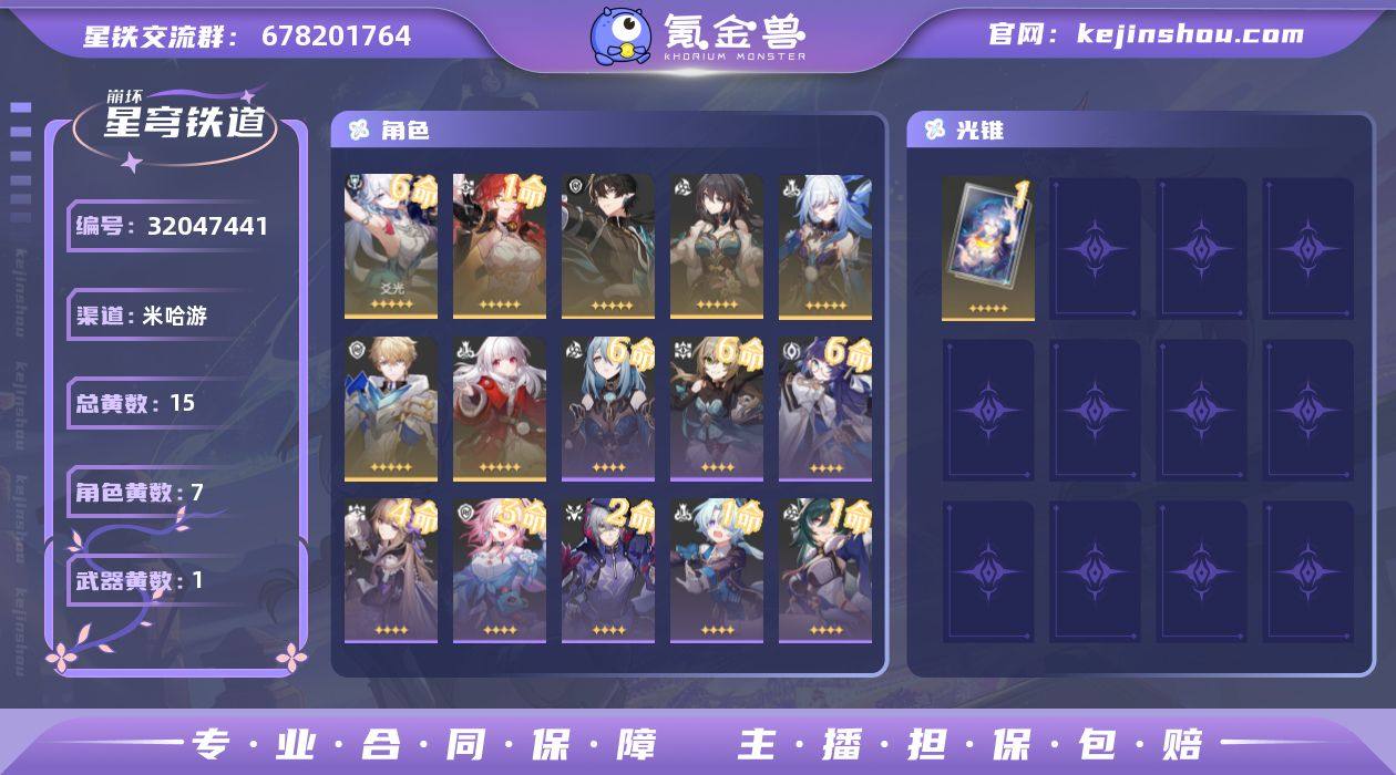 总黄数:15 五星光锥数:1 五星角色数:7 开拓等级:63 开拓者性别:女 星轨专票:2 梦华数量:0 星琼数量:6743 6命爻光,1命姬子,0命丹恒·腾荒,0命阮·梅,0命镜流,0命杰帕德,0命克拉拉 1精当她决定看见 换绑材料:可提供换绑材料 邮箱状态:未绑定 psn绑定情况:否 taptap绑定情况:否 邮箱实名情况:邮箱未实名 卖家说:超欧号,欢愉战舰,6+1爻光,六千多星穹,活动没咋动,可抽花火,单绑手机