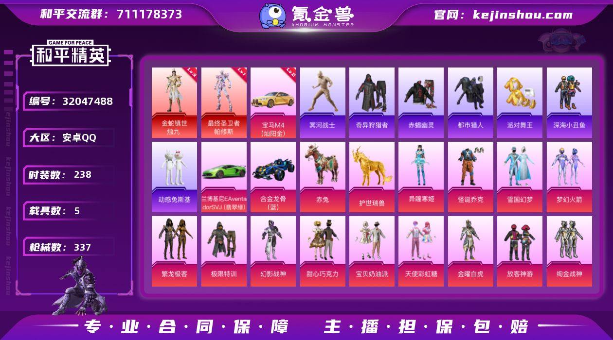 安卓 手Q-无敌战神框-2神装-30粉装-23特效枪-5载具-15粉色飞行器-134452热力值-10王牌印记-238套装-337枪皮 【红色载具】:宝马M4(灿阳金)(二级) 【红色神装等级】:最终圣卫者-帕修斯(一级),金蛇镇世-烛九(三级) 【红色角色神装】:最终圣卫者-帕修斯,金蛇镇世-烛九 【热门品类】:粉装-怪诞乔克,粉装-雪国幻梦,粉装-梦幻火箭,粉装-繁龙极客,套装-浪漫天命,套装-赤蝎幽灵,套装-都市猎人,套装-冥河战士,套装-派对舞王,套装-深海小丑鱼,套装-奇异狩猎者,套装-忍者信条,套装-动感兔斯基人偶服,角色-忠猛周仓,角色-忠真马岱,角色-忠义严颜,套装-暗夜之虎,套装-龟仙人,套装-暗影哥特,套装-浪漫波比,角色-Mark.06,角色-六号稻草人,大砍刀-青龙偃月刀,撬棍-龙胆亮银枪 【粉色套装】:粉装-极限特训,粉装-幻影战神,粉装-怪诞乔克,粉装-甜心巧克力,粉装-宝贝奶油派,粉装-天使彩虹糖,粉装-金曜白虎,粉装-雪国幻梦,粉装-梦幻火箭,粉装-放客神游,粉装-绚金战神,粉装-绮梦青鸾,粉装-吟月归客,粉装-甜心娃娃,粉装-酣梦娃娃,粉装-暗星紫秘,粉装-冷魅冰骑,粉装-赤焰黑爵,粉装-紫电风暴,粉装-暖熊萌萌,粉装-傲雪凌霜,粉装-千面幻镜,角色-蔷薇星,粉装-繁龙极客,角色-烟云彩露,角色-光极星,角色-智耀战神,粉装-幻彩电音,角色-绯穹魔姬,角色-异瞳寒姬 【粉色枪皮等级】:AKM-炫紫旋律(四级),AKM-绿萝繁花(五级),SCAR-L-锦绣绵绵(五级),SCAR-L-金蛇镇世(三级),M416-暖熊萌萌(二级),M416-至情至圣(八级),GROZA-焦糖拿铁(六级),AUG-星梦奇缘(六级),M762-青锋波束(五级),蜜獾-异瞳寒姬(四级),UMP45-恐龙拽拽(四级),Vector-绯穹魔姬(四级),AKS-74U-星穹咏叹调(四级),P90-甜蜜草莓(四级),P90-魔童闹海 敖丙(三级),Kar98K-巳巳如意(五级),Kar98K-圣域龙灵(三级),M...