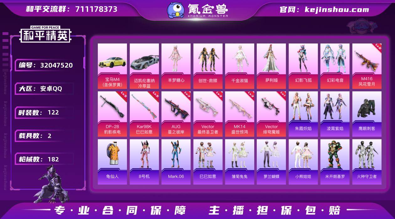 安卓 手Q-6粉装-7特效枪-2载具-10粉色飞行器-59912热力值-9王牌印记-122套装-182枪皮 【热门品类】:套装-龟仙人,角色-8号机,角色-Mark.06 【粉色载具】:宝马M4(圣保罗黄),迈凯伦塞纳(冷萃蓝) 【粉色套装】:套装-创世·救赎,角色-千金淑猫,角色-萨利娅,粉装-幻影飞狐,粉装-幻彩电音,角色-羊梦糖心 【粉色枪皮等级】:M416-风花雪月(六级),AUG-星之彼岸(三级),Vector-最终圣卫者(三级),Vector-绯穹魔姬(一级),Kar98K-巳巳如意(五级),Mk14-盛世惊鸿(三级),DP-28-豹影疾电(五级) 【粉色枪皮】:M416-风花雪月,AUG-星之彼岸,Vector-最终圣卫者,Vector-绯穹魔姬,Kar98K-巳巳如意,Mk14-盛世惊鸿,DP-28-豹影疾电 【粉色飞行器】:繁龙极客飞行器,镜域双华-灵镜之阶,绝色倾城飞行器,鎏金朋克飞行器,霓虹漫游飞行器,星空武士飞行器,幽焰列车飞行器,凤舞九天飞行器,雀灵庇佑飞行器,飞天猪飞行器 【粉色降落伞】:星之彼岸降落伞,闪光银龙降落伞,未来歌姬降落伞,炫光之旅降落伞,猪猪侠降落伞,江南烟雨降落伞,星梦奇缘降落伞,金丰海韵降落伞,千金淑猫降落伞,临安公主降落伞,月影灵韵降落伞,盛世惊鸿降落伞,金蛇镇世降落伞,鬼刀降落伞,幻影飞狐降落伞,彩虹独角兽降落伞,戏水时光降落伞,绯果甜心降落伞,星穹咏叹调降落伞,灵猫魔法师降落伞,桃源时光降落伞,绯穹魔姬降落伞,魔童闹海 哪吒降落伞 【稀有套装】:套装-龟仙人,套装-巳巳如意,套装-雏菊兔兔,套装-萝兰蝴蝶,套装-小熊娃娃,角色-米开朗基罗,套装-火种守卫者,套装-糖糖葫芦,套装-青团波波,角色-都市丽猫,角色-摩登魅猫,角色-俏兔智灵,套装-燕燕于飞,套装-鱼渊荷华,角色-海琴烟,套装-旋风灵鼠,角色-冰晶湖光,套装-新风雅兰,套装-紫幽梦,套装-蓝冰羽,角色-鲛海歌灵,套装-星渊小夜曲,套装-极...