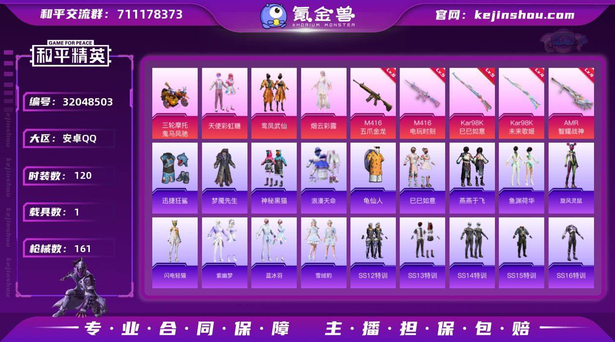 安卓 手Q-3粉装-5特效枪-1载具-0粉色飞行器-48966热力值-5王牌印记-120套装-161枪皮 【热门品类】:套装-浪漫天命,套装-龟仙人 【粉色载具】:鬼马风驰 【粉色套装】:粉装-天使彩虹糖,粉装-鸾凤武仙,角色-烟云彩露 【粉色枪皮等级】:M416-五爪金龙(六级),M416-电玩时刻(五级),Kar98K-未来歌姬(四级),Kar98K-巳巳如意(五级),AMR-智耀战神(四级) 【粉色枪皮】:M416-五爪金龙,M416-电玩时刻,Kar98K-未来歌姬,Kar98K-巳巳如意,AMR-智耀战神 【粉色降落伞】:阿狸红降落伞,夏日绵绵冰降落伞,王牌四分卫降落伞,环太平洋降落伞,江南烟雨降落伞,精灵梦叶罗丽降落伞,创世·救赎降落伞,戏水时光降落伞,时光之誓降落伞 【稀有套装】:套装-龟仙人,套装-巳巳如意,套装-燕燕于飞,套装-鱼渊荷华,套装-旋风灵鼠,套装-闪电轻猫,套装-紫幽梦,套装-蓝冰羽,套装-雪绒豹 【稀有枪皮】:AKM-冰凉西瓜,AKM-夜灯,AKM-破晓战魂,AKM-萌趣颜团子,AKM-龙的传人,AKM-棋盘冕主,M16A4-夜灯,M16A4-幻世战舞者,M16A4-甜心亚梦,M16A4-蓝色火焰,SCAR-L-玉兔迎春,SCAR-L-红色方程式,SCAR-L-黄金龙骨,M416-糯团青竹,M416-红色方程式,M416-蓝色火焰,M416-诡夜天鹅,GROZA-懵萌河马,GROZA-治愈之星,AUG-天降萌叽,AUG-青春冒险家,QBZ-彩虹符号,QBZ-未来歌姬,M762-瑞龙福将,M762-云朵鹅,Mk47-妙红点点,Mk47-炫光之旅,Mk47-青春冒险家,G36C-懵萌河马,G36C-时空追击者,AC-VAL-天降萌叽,AC-VAL-甜心亚梦,蜜獾-垂柳戏鸭,蜜獾-天降萌叽,蜜獾-娇憨猪猪,UZI-墨染幽兰,UZI-天降萌叽,UZI-娇憨猪猪,UZI-炫彩节奏,UMP45-夜灯,UMP45-时空追击者,UMP45-蓝色火焰,Vector-焰鹰斗篷,Vector-彩虹符号,Vector-治愈之星,Vector-生命誓言,Vector-田园牧歌,Vector-音爆索尼克,汤姆逊-天降萌叽,汤...