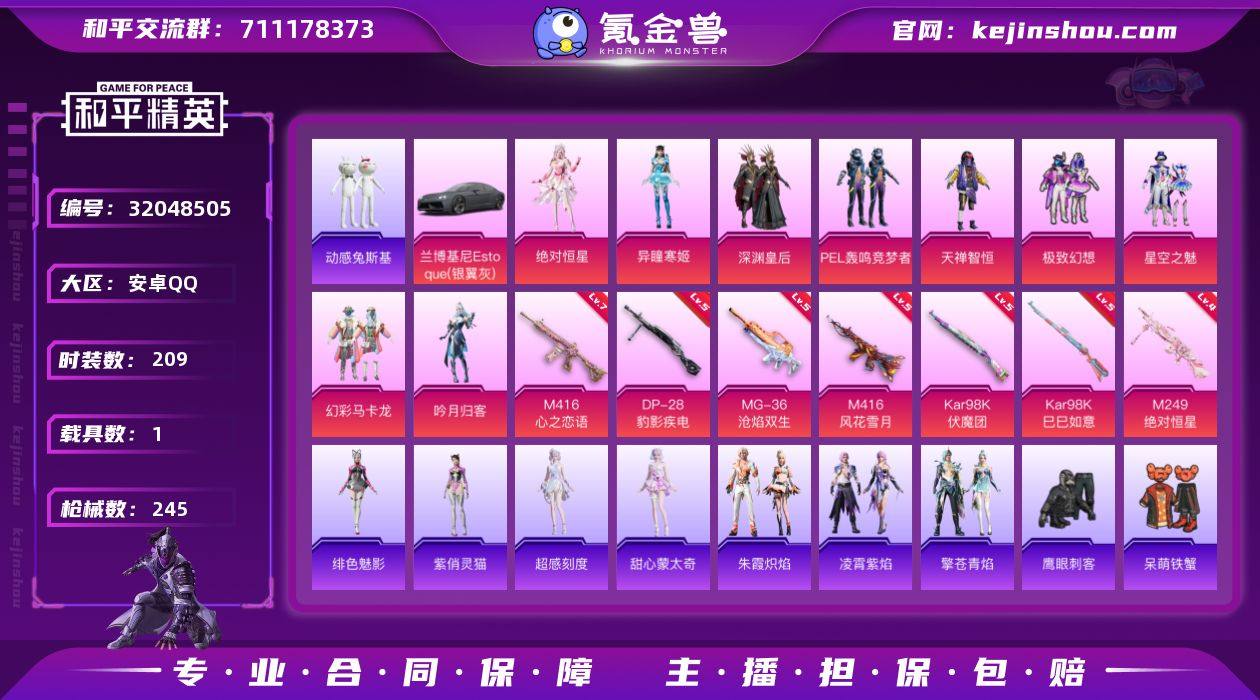 安卓 手Q-9粉装-7特效枪-1载具-6粉色飞行器-87315热力值-12王牌印记-209套装-245枪皮 【热门品类】:套装-浪漫天命,套装-动感兔斯基人偶服,套装-AG战队服,套装-龟仙人,套装-暗影哥特 【粉色套装】:角色-绝对恒星,粉装-深渊皇后,粉装-PEL轰鸣竞梦者,粉装-天禅智恒,粉装-极致幻想,粉装-星空之魅,粉装-幻彩马卡龙,粉装-吟月归客,角色-异瞳寒姬 【粉色枪皮等级】:M416-心之恋语(七级),M416-风花雪月(五级),Kar98K-伏魔团(五级),Kar98K-巳巳如意(五级),M249-绝对恒星(四级),DP-28-豹影疾电(五级),MG-36-沧焰双生(五级) 【粉色载具】:兰博基尼Estoque(银翼灰) 【粉色枪皮】:M416-心之恋语,M416-风花雪月,Kar98K-伏魔团,Kar98K-巳巳如意,M249-绝对恒星,DP-28-豹影疾电,MG-36-沧焰双生 【粉色飞行器】:绝对恒星飞行器,炫彩糖果飞行器,心之恋语飞行翼,马卡龙飞行器,锦绣火鲤飞行器,太空嘟嘟飞行器 【粉色降落伞】:深海曼妙降落伞,绝对恒星降落伞,百万伏特降落伞,春暖花开降落伞,梦幻火箭降落伞,四圣焕新降落伞,心之恋语降落伞,马卡龙降落伞,锦绣火鲤降落伞,银刃赛罗降落伞,星之彼岸降落伞,葫芦兄弟降落伞,暗夜玫瑰降落伞,垂柳戏鸭降落伞,星穹咏叹调降落伞,幻彩电音降落伞,异瞳寒姬降落伞,炫彩糖果降落伞 【稀有套装】:套装-龟仙人,角色-超感刻度,角色-甜心蒙太奇,套装-雪国风尚,套装-炫彩糖果,角色-绛羽幽主,套装-朱霞炽焰,套装-凌霄紫焰,套装-擎苍青焰,角色-绯色魅影,角色-紫俏灵猫 【稀有枪皮】:AUG-冰晶雪宝,AKM-PEL轰鸣竞梦者,AKM-夜灯,AKM-彩虹符号,AKM-影袭,AKM-春暖花开,AKM-生命誓言,AKM-萌趣颜团子,AKM-虎虎生威,AKM-霓虹街区,M16A4-夜灯,M16A4-幻世战舞者,M16A4-甜心亚梦,SCAR-L-夜灯,SCAR-L-暗夜玫瑰,SCAR-L-炫彩节奏,SCAR-...