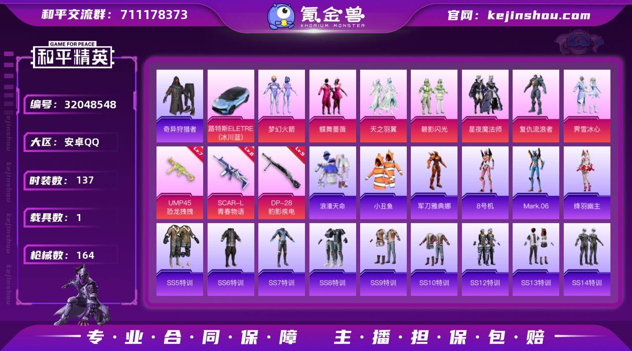 安卓 手Q-8粉装-3特效枪-1载具-2粉色飞行器-56374热力值-2王牌印记-137套装-164枪皮 【热门品类】:粉装-梦幻火箭,套装-浪漫天命,套装-小丑鱼,套装-奇异狩猎者,角色-军刀雅典娜,角色-8号机,角色-Mark.06 【粉色套装】:粉装-梦幻火箭,粉装-蝶舞蔷薇,粉装-天之羽翼,粉装-碧影闪光,粉装-星夜魔法师,角色-复仇流浪者,粉装-霁雪冰心,角色-罪夜之冕 【粉色枪皮等级】:SCAR-L-青春物语(六级),UMP45-恐龙拽拽(七级),DP-28-豹影疾电(五级) 【粉色载具】:路特斯ELETRE(冰川蓝) 【粉色枪皮】:SCAR-L-青春物语,UMP45-恐龙拽拽,DP-28-豹影疾电 【粉色飞行器】:梦幻火箭飞行器,天之羽翼飞行器 【粉色降落伞】:春暖花开降落伞,梦幻火箭降落伞,暗夜玫瑰降落伞,蓝莓炮弹降落伞,流星咚咚降落伞,天之羽翼降落伞,恐龙拽拽降落伞,环太平洋降落伞,初号机 觉醒Ver.降落伞 【稀有套装】:套装-雪国风尚,角色-绛羽幽主,角色-月烬之祷 【稀有枪皮】:AKM-夜灯,AKM-彩虹符号,AKM-恐龙拽拽,AKM-灼热熔岩,AKM-环太平洋,AKM-生命誓言,AKM-破晓战魂,AKM-萌趣颜团子,AKM-虎虎生威,AKM-霓虹街区,M16A4-幻世战舞者,M16A4-甜心亚梦,M16A4-红色方程式,SCAR-L-炫彩节奏,SCAR-L-玉兔迎春,SCAR-L-红色方程式,SCAR-L-青丘仙客,M416-圣诞惊喜,M416-夜灯,M416-暗星紫秘,M416-月影鸳鸯,M416-红色方程式,M416-蓝色火焰,GROZA-异彩先驱,GROZA-彩虹符号,GROZA-恐龙拽拽,GROZA-银河战甲,AUG-凝视深渊,AUG-耀粉歌者,QBZ-彩虹符号,QBZ-洛神天依,QBZ-绚金瑰梦,QBZ-飞驰魅影,M762-拳皇97,M762-枪炮玫瑰,M762-橘柚倾心,M762-牛气冲天,M762-瑞龙福将,Mk47-天之羽翼,G36C-暗夜玫瑰,G36C-炙焰牛王,G36C-青丘仙客,AC-VAL-天降萌叽,AC-VAL-甜心亚梦,蜜獾-垂柳戏鸭,蜜獾-娇憨猪猪,UZI-啾...