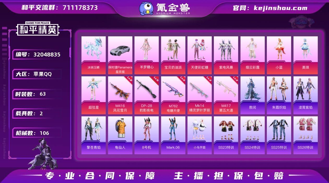 苹果 手Q-8粉装-5特效枪-2载具-4粉色飞行器-34190热力值-2王牌印记-63套装-106枪皮 【热门品类】:套装-龟仙人,角色-8号机,角色-Mark.06 【粉色载具】:保时捷Panamera(星辰紫),冰绡玉鳞 【粉色套装】:粉装-宝贝奶油派,粉装-天使彩虹糖,粉装-紫电风暴,角色-烟云彩露,角色-小蓝,角色-美琪,角色-超弦星,角色-羊梦糖心 【粉色枪皮等级】:M416-风花雪月(六级),M762-电糖天使(四级),Mk14-精灵梦叶罗丽(三级),M417-第五大道(三级),DP-28-豹影疾电(五级) 【粉色枪皮】:M416-风花雪月,M762-电糖天使,Mk14-精灵梦叶罗丽,M417-第五大道,DP-28-豹影疾电 【粉色飞行器】:齐天大圣飞行器,电糖天使飞行器,龙翔九天飞行器,幻海精灵飞行器 【粉色降落伞】:星之信仰降落伞,冷魅冰骑降落伞,圣光天使降落伞,第五大道降落伞,仲夏莫吉托降落伞,镜域双华降落伞,江南烟雨降落伞,星空武士降落伞,精灵梦叶罗丽降落伞,墨龙九天降落伞,创世·救赎降落伞,守护天翼降落伞,无垠阁降落伞,喜羊羊与灰太狼降落伞 【稀有套装】:套装-龟仙人,套装-小鸟芋圆,套装-朱霞炽焰,套装-凌霄紫焰,套装-擎苍青焰,角色-敖闰 【稀有枪皮】:AKM-恐龙拽拽,AKM-江南烟雨,AKM-胡桃卫兵,AKM-龙的传人,M16A4-幻世战舞者,SCAR-L-甜蜜誓约,M416-糯团青竹,GROZA-懵萌河马,AUG-天降萌叽,QBZ-彩虹符号,M762-天降萌叽,M762-甜心宝贝,M762-第五大道,Mk47-天之羽翼,Mk47-妙红点点,G36C-懵萌河马,G36C-星穹咏叹调,蜜獾-天降萌叽,Famas-墨龙九天,ARX-凌霄紫焰,UZI-天降萌叽,UMP45-仲夏莫吉托,UMP45-生命誓言,Vector-焰鹰斗篷,Vector-彩虹符号,Vector-创世·救赎,汤姆逊-天降萌叽,MP5K-飒粉甜心,JS9-凌霄紫焰,Kar98K-彩虹符号,M24-仲夏莫吉托,M24-幻彩电音,AWM-焰鹰斗篷,VSS-未来战士,Mini14-辉耀...