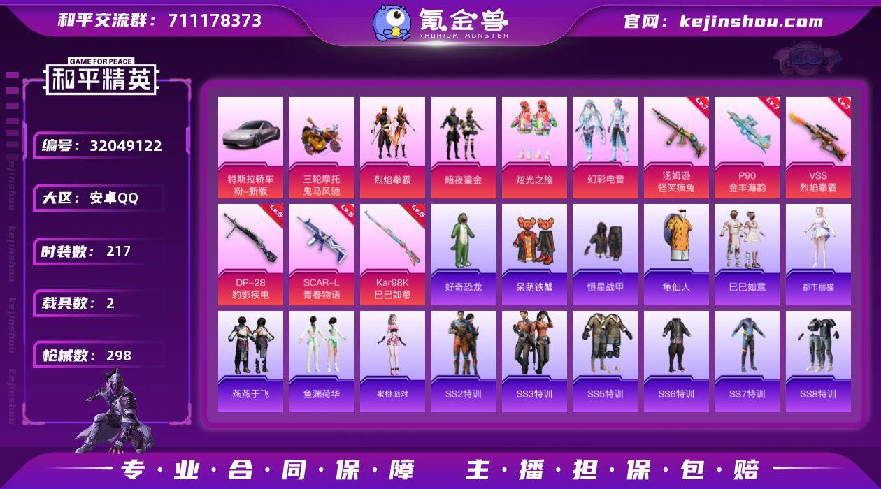 安卓 手Q-4粉装-6特效枪-2载具-1粉色飞行器-94364热力值-18王牌印记-217套装-298枪皮 【热门品类】:旭日初心兜帽大衣,套装-龟仙人,小恶魔头饰 【粉色载具】:特斯拉Roadster(沁心粉),鬼马风驰 【粉色套装】:粉装-烈焰拳霸,粉装-暗夜鎏金,粉装-炫光之旅,粉装-幻彩电音 【粉色枪皮等级】:SCAR-L-青春物语(五级),汤姆逊-怪笑疯兔(七级),P90-金丰海韵(七级),Kar98K-巳巳如意(五级),VSS-烈焰拳霸(七级),DP-28-豹影疾电(五级) 【粉色枪皮】:SCAR-L-青春物语,汤姆逊-怪笑疯兔,P90-金丰海韵,Kar98K-巳巳如意,VSS-烈焰拳霸,DP-28-豹影疾电 【粉色飞行器】:庄周梦蝶飞行器 【粉色降落伞】:百万伏特降落伞,精灵迷巫降落伞,梦幻火箭降落伞,神秘黑猫降落伞,伏魔团降落伞,四圣焕新降落伞,银刃赛罗降落伞,怪笑疯兔降落伞,暗夜玫瑰降落伞,洛神天依降落伞,海渊国主降落伞,恐龙拽拽降落伞,暗夜鎏金降落伞,第五大道降落伞,变形金刚降落伞,无垠阁降落伞 【稀有套装】:套装-龟仙人,套装-巳巳如意,角色-都市丽猫,套装-燕燕于飞,套装-鱼渊荷华,角色-蜜桃派对 【稀有枪皮】:AKM-冰凉西瓜,AKM-四圣焕新,AKM-彩虹符号,AKM-恐龙拽拽,AKM-星兔领航员,AKM-灼热熔岩,AKM-破晓战魂,AKM-萌趣颜团子,AKM-虎虎生威,AKM-霓虹街区,AKM-龙的传人,M16A4-幻世战舞者,M16A4-机械英豪,M16A4-甜心亚梦,M16A4-红色方程式,M16A4-蓝色火焰,SCAR-L-夜灯,SCAR-L-炫彩节奏,SCAR-L-玉兔迎春,SCAR-L-粉色回忆,SCAR-L-红色方程式,M416-夜灯,M416-糯团青竹,M416-红色方程式,M416-蓝色火焰,GROZA-彩虹符号,GROZA-懵萌河马,GROZA-治愈之星,GROZA-生命誓言,GROZA-田园牧歌,GROZA-黑色刀锋,AUG-天降萌叽,AUG-怪笑疯兔,AUG-海螺星光,AUG-纯梦嫁纱,AUG-耀粉歌者,AUG-青春冒险家,QBZ-原初...