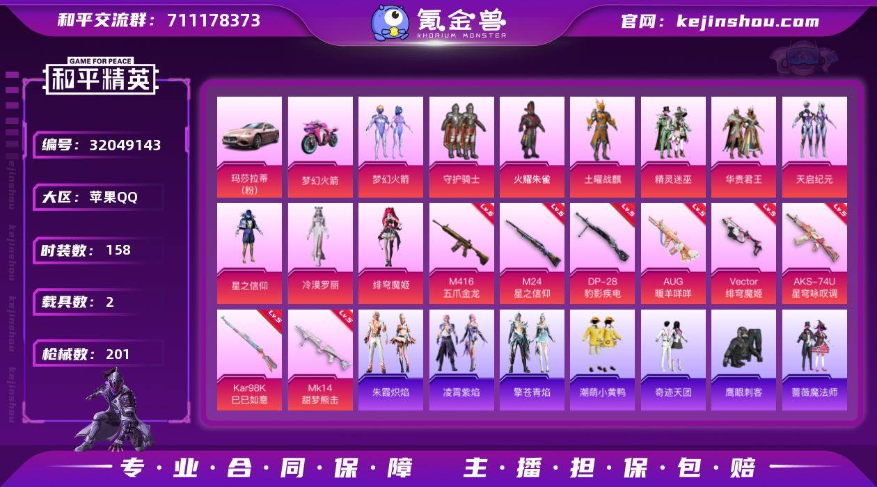 苹果 手Q-10粉装-8特效枪-2载具-5粉色飞行器-74055热力值-5王牌印记-158套装-201枪皮 【热门品类】:粉装-梦幻火箭,套装-龟仙人,套装-潮萌小黄鸭 【粉色载具】:玛莎拉蒂Ghibli(粉),双人摩托-梦幻火箭 【粉色套装】:粉装-守护骑士,粉装-火曜朱雀,粉装-土曜战麒,粉装-精灵迷巫,粉装-梦幻火箭,粉装-华贵君王,粉装-天启纪元,粉装-星之信仰,角色-冷漠罗丽,角色-绯穹魔姬 【粉色枪皮等级】:M416-五爪金龙(六级),AUG-暖羊咩咩(五级),Vector-绯穹魔姬(五级),AKS-74U-星穹咏叹调(五级),Kar98K-巳巳如意(五级),M24-星之信仰(六级),Mk14-甜梦熊击(五级),DP-28-豹影疾电(五级) 【粉色枪皮】:M416-五爪金龙,AUG-暖羊咩咩,Vector-绯穹魔姬,AKS-74U-星穹咏叹调,Kar98K-巳巳如意,M24-星之信仰,Mk14-甜梦熊击,DP-28-豹影疾电 【粉色飞行器】:春暖花开飞行器,精灵迷巫飞行器,梦幻火箭飞行器 【粉色降落伞】:深海曼妙降落伞,快乐主宰降落伞,至尊龙雀降落伞,雪国幻梦降落伞,春暖花开降落伞,精灵迷巫降落伞,梦幻火箭降落伞,华贵君王降落伞,天启纪元降落伞,星之信仰降落伞,龙虾霸霸降落伞,香水柠檬降落伞,环太平洋降落伞,暖熊萌萌降落伞,星穹咏叹调降落伞,幻彩电音降落伞,冷漠罗丽降落伞,荧海星豚降落伞,桃源时光降落伞,绯穹魔姬降落伞,喜羊羊与灰太狼降落伞 【稀有套装】:套装-龟仙人,套装-巳巳如意,套装-雏菊兔兔,套装-萝兰蝴蝶,套装-燕燕于飞,套装-鱼渊荷华,套装-粉恋花,套装-紫幽梦,套装-蓝冰羽,套装-星影赞美诗,套装-云朵鹅,套装-雪绒豹,角色-乐音,套装-蜜露汐语,角色-绛羽幽主,角色-夜瞳黯灵,套装-朱霞炽焰,套装-凌霄紫焰,套装-擎苍青焰 【稀有枪皮】:AKM-天启纪元,AKM-星之信仰,AKM-春暖花开,AKM-霓虹街区,M16A4-快乐主宰,M16A4-魔法学院,M16...