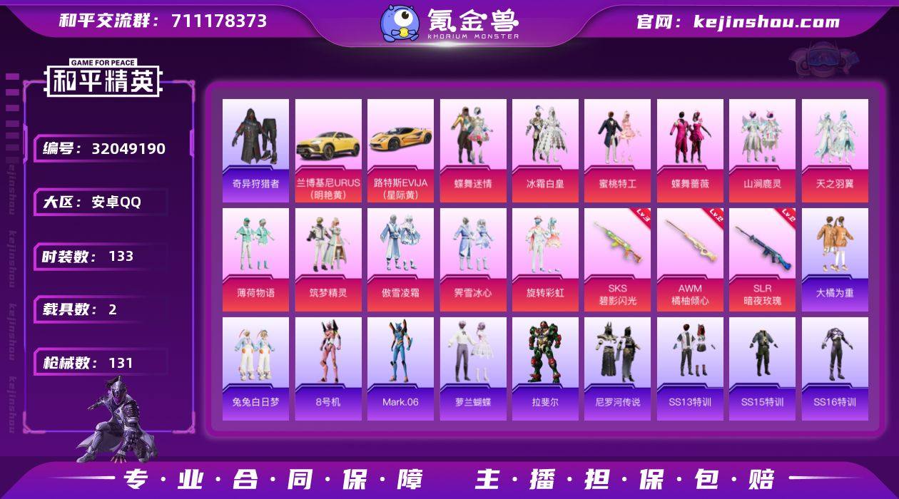 【1121】安卓 手Q-11粉装-3特效枪-2载具-2粉色飞行器-49963热力值-3王牌印记-133套装-131枪皮 【热门品类】:套装-奇异狩猎者,角色-8号机,角色-Mark.06 【粉色载具】:兰博基尼URUS(明艳黄),路特斯EVIJA(星际黄) 【粉色套装】:粉装-蝶舞迷情,粉装-冰霜白皇,粉装-蜜桃特工,粉装-蝶舞蔷薇,粉装-山涧鹿灵,粉装-天之羽翼,粉装-薄荷物语,粉装-筑梦精灵,粉装-傲雪凌霜,粉装-霁雪冰心,粉装-旋转彩虹 【粉色枪皮等级】:AWM-橘柚倾心(二级),SKS-碧影闪光(三级),SLR-暗夜玫瑰(二级) 【粉色枪皮】:AWM-橘柚倾心,SKS-碧影闪光,SLR-暗夜玫瑰 【粉色飞行器】:天之羽翼飞行器,翩跹演武飞行器 【粉色降落伞】:甜心宝贝降落伞,神秘黑猫降落伞,暗翼战神降落伞,星之彼岸降落伞,烈焰拳霸降落伞,枪炮玫瑰降落伞,暗夜玫瑰降落伞,天之羽翼降落伞,橘柚倾心降落伞,炙焰牛王降落伞,垂柳戏鸭降落伞,守护天翼降落伞,忍者神龟降落伞 【稀有套装】:套装-萝兰蝴蝶,角色-拉斐尔,套装-尼罗河传说 【稀有枪皮】:AKM-奇异狩猎者,AKM-彩虹符号,AKM-灼热熔岩,AKM-破晓战魂,AKM-萌趣颜团子,AKM-虎虎生威,M16A4-幻世战舞者,M16A4-甜心亚梦,M16A4-蓝色火焰,SCAR-L-暗夜玫瑰,SCAR-L-玉兔迎春,SCAR-L-碧影闪光,M416-红色方程式,M416-蓝色火焰,GROZA-异彩先驱,GROZA-彩虹符号,AUG-天降萌叽,AUG-灵符少年,AUG-耀粉歌者,AUG-青春冒险家,QBZ-彩虹符号,QBZ-暗翼战神,QBZ-神秘黑猫,QBZ-飞驰魅影,M762-奇异狩猎者,M762-枪炮玫瑰,M762-橘柚倾心,M762-瑞龙福将,M762-绒雪飘舞,Mk47-天之羽翼,Mk47-青春冒险家,G36C-古战神甲,G36C-暗夜玫瑰,AC-VAL-天降萌叽,AC-VAL-甜心亚梦,蜜獾-垂柳戏鸭,蜜獾-娇憨猪猪,UZI-娇憨猪猪,UZI-炫彩节奏,UZI-红色方程式,UMP45-生命誓言,Vector-治愈之...