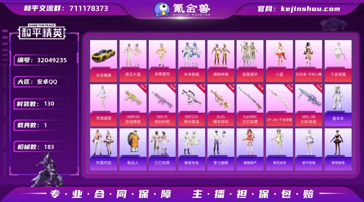 安卓 手Q-9粉装-7特效枪-1载具-3粉色飞行器-57437热力值-4王牌印记-130套装-183枪皮 【热门品类】:套装-龟仙人 【粉色载具】:永恒黄蜂 【粉色套装】:粉装-第五大道,角色-呆萌星弥,粉装-未来歌姬,粉装-拂晓神骑,粉装-射星猎手,角色-小蓝,角色-狂花道·不知火舞,角色-千金淑猫,角色-荧海星豚 【粉色枪皮等级】:M416-电玩时刻(五级),GROZA-镜光银凌(五级),AUG-暖羊咩咩(五级),UMP45-恐龙拽拽(七级),Kar98K-巳巳如意(五级),DP-28-千金淑猫(五级),MG-36-幻彩电音(五级) 【粉色枪皮】:M416-电玩时刻,GROZA-镜光银凌,AUG-暖羊咩咩,UMP45-恐龙拽拽,Kar98K-巳巳如意,DP-28-千金淑猫,MG-36-幻彩电音 【粉色飞行器】:黄族统领飞行器,白勺歌姬飞行器,绝色倾城飞行器 【粉色降落伞】:精灵迷巫降落伞,洛神天依降落伞,翩跹演武降落伞,彩虹甜喵降落伞,千面幻镜降落伞,旋转彩虹降落伞,飒粉甜心降落伞,未来歌姬降落伞,炫光之旅降落伞,莲影清波降落伞,精灵梦叶罗丽降落伞,千金淑猫降落伞,雪月幻音降落伞,幻彩电音降落伞 【稀有套装】:套装-龟仙人,套装-巳巳如意,套装-雏菊兔兔,套装-萝兰蝴蝶,套装-糖糖葫芦,套装-青团波波,角色-都市丽猫,角色-摩登魅猫,角色-临安公主,套装-燕燕于飞,套装-鱼渊荷华,角色-糖霜甜心,套装-粉恋花,套装-紫幽梦,套装-蓝冰羽,套装-极速光影,套装-彩虹兔,套装-云朵鹅,套装-雪绒豹,套装-蜜露汐语,套装-朱霞炽焰,玩偶服-喜羊羊 【稀有枪皮】:AKM-彩虹符号,AKM-星兔领航员,AKM-霓虹街区,M16A4-幻世战舞者,M16A4-千金淑猫,SCAR-L-炫彩节奏,SCAR-L-玉兔迎春,M416-暗夜行者,M416-糯团青竹,GROZA-恐龙拽拽,GROZA-懵萌河马,GROZA-田园牧歌,AUG-耀粉歌者,QBZ-未来歌姬,QBZ-洛神天依,M762-云朵鹅,Mk47-妙红点点,Mk47-洛神天依,G36C-...