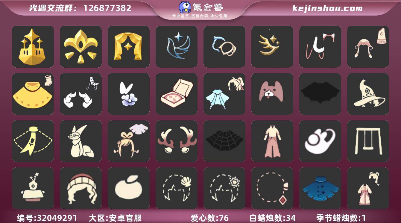 【 XT0587】 ✅官服11季奶14白枭武士裤巫师围巾暗陨蝙蝠蛛网绊爱皮皮猫水母冥龙秋千水晶超多礼包 ✅渠道 :安卓手机号✅4.5可换绑 ✅最高:2.396最矮:14.396目前:3.299 ✅资源:蜡烛:34爱心:76翼数量:102 ✅毕业地图:雨林,霞谷,墓土 ✅毕业季节:梦想季,集结季,表演季,破晓季半,夜行季卡,九色鹿季半,筑巢季半,二重奏季半,青鸟季,双星季,迁徙季 ✅礼包:日光水母,月华套装,阔腿牛仔,光之生物,连衣裙,玉兔拖鞋,冥龙套装,活力海牛,皮皮猫套装,多彩绒帽,巫师帽,海洋发型,蝴蝶与花,桔子,小狗头饰,雪花发卡,贝壳发夹,玉兔头饰,四叶草,粽子发饰,小黄鸭发饰,彩虹耳机,日光耳环,满月耳坠,圣诞鹿角,金鳞耳坠,彩虹耳钉,王子围巾,暗陨斗篷,线框斗篷,蝙蝠斗篷,蛛网斗篷,绊爱套装,青衫落拓,小黄鸭雨衣,音韵吉他,秋千,花憩茶桌,必胜客披萨,狐狸背包,记忆水晶 ✅热门物品:白枭,武士裤,背带裤,白棉裤,搓澡巾,灯笼裤,宝宝裤,矮人面具,黑脸,公主头,粗辫,书虫,正太,高马尾,箬笠,明制帽,花环,虚荣,樱花,猫猫头,红耳机,吉他,雨伞