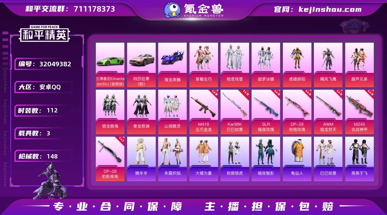 安卓 手Q-9粉装-7特效枪-3载具-2粉色飞行器-54056热力值-6王牌印记-112套装-148枪皮 【热门品类】:套装-龟仙人 【粉色载具】:兰博基尼Aventador SVJ(翡翠绿),玛莎拉蒂Ghibli(粉),海龙奔腾 【粉色套装】:粉装-草莓生巧,粉装-相思残雪,粉装-甜梦冰蝶,粉装-虎啸骄阳,粉装-飓风飞鹰,粉装-葫芦兄弟,粉装-银龙傲海,粉装-骨龙祭渊,粉装-山涧鹿灵 【粉色枪皮等级】:M416-五爪金龙(六级),Kar98K-巳巳如意(五级),AWM-焰龙焚天(四级),SLR-暗夜玫瑰(五级),M249-古战神甲(四级),DP-28-枪炮玫瑰(五级),DP-28-豹影疾电(一级) 【粉色枪皮】:M416-五爪金龙,Kar98K-巳巳如意,AWM-焰龙焚天,SLR-暗夜玫瑰,M249-古战神甲,DP-28-枪炮玫瑰,DP-28-豹影疾电 【粉色飞行器】:夏日绵绵冰飞行器,古战神甲飞行器 【粉色降落伞】:深海曼妙降落伞,粉色回忆降落伞,神秘黑猫降落伞,夏日绵绵冰降落伞,银刃赛罗降落伞,王牌四分卫降落伞,星之彼岸降落伞,相思残雪降落伞,烈焰拳霸降落伞,枪炮玫瑰降落伞,暗夜玫瑰降落伞,赛博古神降落伞 【稀有套装】:套装-龟仙人,套装-巳巳如意,套装-燕燕于飞,套装-鱼渊荷华,套装-白辉玉蕊,套装-粉恋花,套装-紫幽梦,套装-蓝冰羽,套装-彩虹兔,套装-云朵鹅,套装-雪绒豹,套装-朱霞炽焰,玩偶服-懒羊羊 【稀有枪皮】:AKM-破晓战魂,AKM-萌趣颜团子,AKM-虎虎生威,AKM-龙的传人,M16A4-红色方程式,M16A4-蓝色火焰,SCAR-L-夏日绵绵冰,SCAR-L-暗夜玫瑰,SCAR-L-生命誓言,SCAR-L-红色方程式,SCAR-L-冷漠罗丽,M416-神秘黑猫,M416-糯团青竹,M416-葫芦兄弟,GROZA-懵萌河马,GROZA-治愈之星,GROZA-生命誓言,AUG-天降萌叽,AUG-怪笑疯兔,AUG-焰龙焚天,AUG-耀粉歌者,AUG-青春冒险家,QBZ-彩虹符号,QBZ-电玩视界,QBZ-神秘黑猫,QBZ-赛罗,M762-奇异狩猎者,...