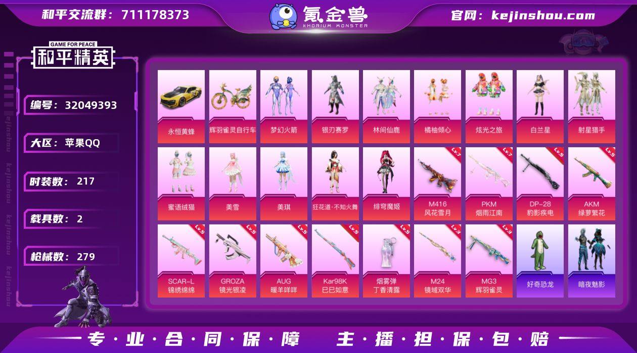 苹果 手Q-12粉装-11特效枪-2载具-7粉色飞行器-98094热力值-17王牌印记-217套装-279枪皮 【热门品类】:粉装-梦幻火箭,套装-SS1特训,角色-忠猛周仓,角色-忠真马岱,角色-忠义严颜,套装-龟仙人,套装-粉红小猪,角色-8号机,角色-Mark.06,小恶魔头饰,大砍刀-青龙偃月刀,撬棍-龙胆亮银枪 【粉色载具】:永恒黄蜂,辉羽雀灵自行车 【粉色套装】:粉装-梦幻火箭,粉装-银刃赛罗,粉装-林间仙鹿,粉装-橘柚倾心,粉装-炫光之旅,角色-白兰星,粉装-射星猎手,粉装-蜜语绒猫,角色-美雪,角色-美琪,角色-狂花道·不知火舞,角色-绯穹魔姬 【粉色枪皮等级】:AKM-绿萝繁花(五级),SCAR-L-锦绣绵绵(五级),M416-风花雪月(七级),GROZA-镜光银凌(五级),AUG-暖羊咩咩(五级),Kar98K-巳巳如意(五级),M24-镜域双华(三级),DP-28-豹影疾电(五级),MG3-辉羽雀灵(三级),PKM-江南烟雨(七级),烟雾弹-丁香清露(五级) 【粉色枪皮】:AKM-绿萝繁花,SCAR-L-锦绣绵绵,M416-风花雪月,GROZA-镜光银凌,AUG-暖羊咩咩,Kar98K-巳巳如意,M24-镜域双华,DP-28-豹影疾电,MG3-辉羽雀灵,PKM-江南烟雨,烟雾弹-丁香清露 【粉色飞行器】:梦幻火箭飞行器,荧光虫舞飞行器,林间仙鹿飞行器,超新星飞行器,镜域双华-灵镜之阶,凤舞九天飞行器,雀灵庇佑飞行器 【粉色降落伞】:快乐主宰降落伞,春暖花开降落伞,梦幻火箭降落伞,锦绣火鲤降落伞,荧光虫舞降落伞,银刃赛罗降落伞,香水柠檬降落伞,暗夜玫瑰降落伞,齐天大圣降落伞,星夜魔法师降落伞,环太平洋降落伞,圣堂之誓降落伞,镜域双华降落伞,江南烟雨降落伞,精灵梦叶罗丽降落伞,拳皇·狂花道降落伞,星穹咏叹调降落伞,辉羽雀灵降落伞,幻彩电音降落伞,喜羊羊与灰太狼降落伞 【稀有套装】:套装-龟仙人,套装-雏菊兔兔,套装-萝兰蝴蝶,角色-光矢逐梦,套装-燕燕于飞,...