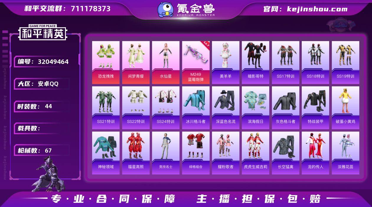安卓 手Q-3粉装-1特效枪-0载具-0粉色飞行器-23518热力值-3王牌印记-44套装-67枪皮 【热门品类】:套装-暗影哥特 【粉色套装】:粉装-恐龙拽拽,粉装-闲梦青缨,角色-水仙星 【粉色枪皮等级】:M249-蓝莓炮弹(七级) 【粉色枪皮】:M249-蓝莓炮弹 【粉色降落伞】:洛神天依降落伞,蓝莓炮弹降落伞,绿意幻情降落伞,流星咚咚降落伞,恐龙拽拽降落伞,环太平洋降落伞,猪猪侠降落伞,精灵梦叶罗丽降落伞,喜羊羊与灰太狼降落伞 【稀有套装】:玩偶服-美羊羊 【稀有枪皮】:AKM-彩虹符号,AKM-春暖花开,AKM-缤纷海域,AKM-虎虎生威,GROZA-恐龙拽拽,GROZA-蓝莓炮弹,QBZ-洛神天依,QBZ-神秘黑猫,QBZ-绚金瑰梦,QBZ-飞驰魅影,M762-天降萌叽,AC-VAL-闲梦青缨,蜜獾-天降萌叽,UZI-影袭,UZI-炫彩节奏,UMP45-灵符少年,Vector-龙行天下,汤姆逊-林间仙鹿,MP5K-蓝莓炮弹,P90-筑梦精灵,P90-飞驰魅影,Kar98K-蓝莓炮弹,Kar98K-飞驰魅影,AWM-恐龙拽拽,AWM-音爆索尼克,SKS-未来歌姬,Mini14-筑梦精灵,Mk14-绚金瑰梦,M417-惊鸿侠骨,MK20-H-莲影清波,M200-惊鸿侠骨,S686-生命誓言,S1897-星夜魔法师,S1897-飞驰魅影,S12K-玩趣呆呆,M249-彩虹符号,MG3-惊鸿侠骨,P18C-镜光幻境,蝎式手枪-闲梦青缨,沙漠之鹰-旋转彩虹,爆炸猎弓-惊鸿侠骨 【其他套装】:套装-SS17特训,套装-SS18特训,套装-SS19特训,套装-SS21特训,套装-SS22特训,套装-SS24特训,套装-冰川格斗者,套装-暗影哥特,套装-深蓝色名流,套装-滨海假日,套装-灰色格斗者,套装-特战装甲,套装-破蛋小黄鸡,套装-神秘领域,套装-福星高照,套装-竞技名士,套装-绯格组合,套装-耀粉歌者,套装-虎虎生威吉莉,套装-长空猛禽,套装-龙的传人,套装-淡雅花蕊,套装-冰爽风暴,套装-爆裂葡萄,套装-炫光向阳,套装-飞驰魅影,套装-音速流光,套装...