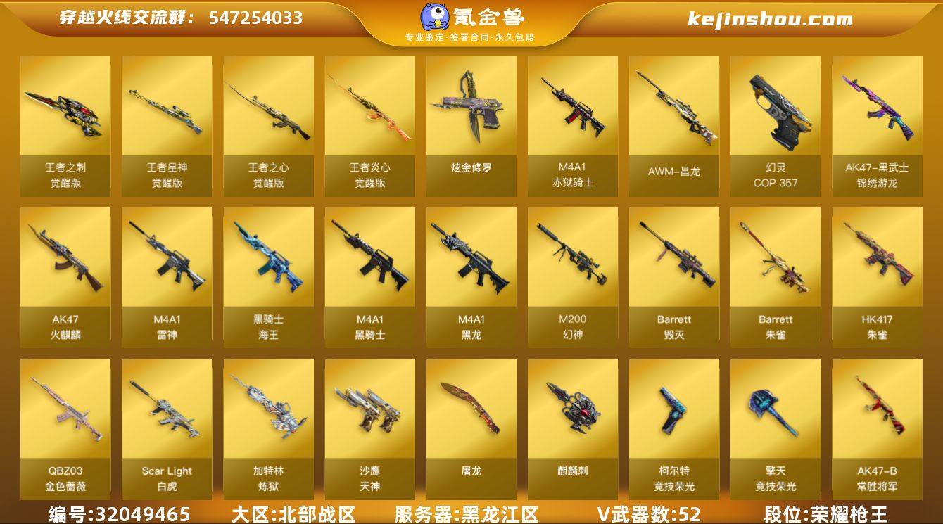 黑龙江区-55V-4王者-1炫金 【热门武器】:QBZ03-金色蔷薇,M14EBR-玄武,Scar Light-白虎,HK417-朱雀,M4A1-青龙,M200-幻神,M4A1-黑骑士,加特林-炼狱,斯泰尔-蝴蝶,羊驼玩偶,USP-雷暴,COP 357-幻灵 【王者炫金武器】:炫金修罗 【音效卡】:M4A1-雷神音效卡,M4A1-黑骑士音效卡,Barrett-毁灭音效卡,Barrett-碧霄极光音效卡 【皮肤】:幻神-青鹤,雷神-耀金皮肤,雷神-烈虎皮肤,雷神-荣耀世冠AG,火麒麟-AG战队皮肤,火麒麟-平天大圣,火麒麟-百城,毁灭-星空,毁灭-黑大圣皮肤,M4A1-千变-孔明皮肤,黑龙-能量核心,AK47-B-常胜将军-曹操,AK47-B-常胜将军-刘备,AK47-B-常胜将军-孙权,AWM-天龙-传奇70KG 【角色】:雨棠,电竞教官-云悠悠,战地猎狐,暗夜-X,初恋灵狐,风暴女,虎妞,灵狐者-七夕宝贝,灵狐者-职业经理,龙儿-小淘气,潘多拉-X,潘多拉-甜心教官,青霞仙子,铁骑荣耀,影武者-X 【人偶武器】:斯泰尔-蝴蝶,COP-旗袍,迷你深渊冰龙,闪光弹-貂蝉,高爆手雷-大乔,迷你巨石泰坦-魔花研究所 【暴走生化】:超级对讲机 【挑战大师】:激光毁灭者III-白马银枪 【英雄级武器】:AK47-火麒麟,M4A1-黑龙,M4A1-雷神,M4A1-黑骑士,M4A1-青龙,HK417-朱雀,Scar Light-白虎,M14EBR-玄武,黑武士-锦绣游龙,QBZ03-金色蔷薇,王者之心-觉醒版,王者炎心-觉醒版,黑骑士-海王,AK47-B-常胜将军,Barrett-毁灭,M200-幻神,Barrett-朱雀,王者星神-觉醒版,加特林-炼狱,沙鹰-天神,USP-雷暴,COP 357-幻灵,柯尔特-竞技荣光,屠龙,麒麟刺,擎天-竞技荣光,斩神刀-雷暴,王者之刺-觉醒版,高爆手雷-雷暴*4,高爆手雷-竞技荣光*5,闪光弹-雷暴*4,闪光弹-竞技荣光*4,烟雾弹-雷暴*4,烟雾弹-竞技荣光*4,M4A1-赤狱骑士,AWM-昌龙 【道具】:XROCK炫彩背包,虎牙炫彩背包,超级背包,女皇终结者-...