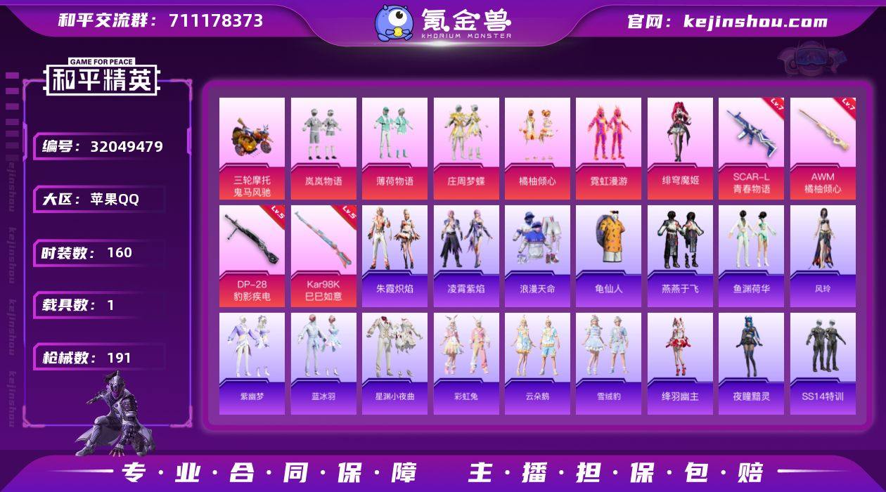 苹果 手Q-6粉装-4特效枪-1载具-1粉色飞行器-63606热力值-12王牌印记-160套装-191枪皮 【热门品类】:套装-浪漫天命,套装-龟仙人 【粉色载具】:鬼马风驰 【粉色套装】:粉装-岚岚物语,粉装-薄荷物语,粉装-庄周梦蝶,粉装-橘柚倾心,粉装-霓虹漫游,角色-绯穹魔姬 【粉色枪皮等级】:SCAR-L-青春物语(七级),Kar98K-巳巳如意(五级),AWM-橘柚倾心(七级),DP-28-豹影疾电(五级) 【粉色枪皮】:SCAR-L-青春物语,Kar98K-巳巳如意,AWM-橘柚倾心,DP-28-豹影疾电 【粉色飞行器】:庄周梦蝶飞行器 【粉色降落伞】:庄周梦蝶降落伞,橘柚倾心降落伞,第五大道降落伞,江南烟雨降落伞,精灵梦叶罗丽降落伞,创世·救赎降落伞,鬼刀降落伞,绯穹魔姬降落伞 【稀有套装】:套装-龟仙人,套装-燕燕于飞,套装-鱼渊荷华,角色-风玲,套装-紫幽梦,套装-蓝冰羽,套装-星渊小夜曲,套装-彩虹兔,套装-云朵鹅,套装-雪绒豹,角色-绛羽幽主,角色-夜瞳黯灵,套装-朱霞炽焰,套装-凌霄紫焰 【稀有枪皮】:AKM-夜灯,AKM-影袭,AKM-破晓战魂,AKM-霓虹街区,AKM-龙的传人,M16A4-幻世战舞者,M16A4-甜心亚梦,M16A4-红色方程式,M16A4-蓝色火焰,SCAR-L-炫彩节奏,SCAR-L-玉兔迎春,SCAR-L-红色方程式,M416-糯团青竹,M416-紫翼圣骑,M416-红色方程式,M416-蓝色火焰,M416-萌萌史莱姆,GROZA-懵萌河马,GROZA-田园牧歌,GROZA-紫翼圣骑,GROZA-雷霆特警,GROZA-青春物语,AUG-耀粉歌者,AUG-青春冒险家,QBZ-洛神天依,QBZ-飞驰魅影,M762-天降萌叽,M762-奇异狩猎者,M762-彩虹符号,M762-橘柚倾心,M762-瑞龙福将,M762-绯红前夜,M762-云朵鹅,Mk47-妙红点点,G36C-冷魅冰骑,G36C-懵萌河马,AC-VAL-甜心亚梦,蜜獾-娇憨猪猪,ARX-凌霄紫焰,UZI-天降萌叽,UZI-娇憨猪猪,UZI-影袭,UZI-炫彩节奏,UZI-红色方程式,UZI-金玉...