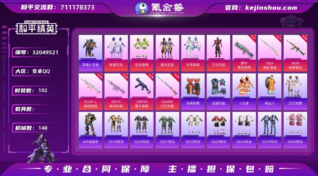 安卓 手Q-5粉装-7特效枪-0载具-2粉色飞行器-47011热力值-9王牌印记-102套装-148枪皮 【热门品类】:套装-深海小丑鱼,套装-小丑鱼,套装-龟仙人 【粉色套装】:粉装-新星烈龙,粉装-恐龙拽拽,粉装-朗月武圣,粉装-未来歌姬,角色-万古烈焰 【粉色枪皮等级】:AKM-绿萝繁花(五级),SCAR-L-锦绣绵绵(五级),M416-电玩时刻(五级),UMP45-量子极限(五级),野牛-青空秋雨(七级),Kar98K-巳巳如意(五级),M24-莲影清波(七级) 【粉色枪皮】:AKM-绿萝繁花,SCAR-L-锦绣绵绵,M416-电玩时刻,UMP45-量子极限,野牛-青空秋雨,Kar98K-巳巳如意,M24-莲影清波 【粉色飞行器】:超新星飞行器,沙丘之主天马 【粉色降落伞】:星之彼岸降落伞,洛神天依降落伞,暗夜鎏金降落伞,音爆索尼克降落伞,第五大道降落伞,万古烈焰降落伞,莲影清波降落伞,圣堂之誓降落伞 【稀有套装】:套装-龟仙人,套装-巳巳如意,角色-米开朗基罗 【稀有枪皮】:AKM-灼热熔岩,AKM-缤纷海域,AKM-龙的传人,M16A4-幻世战舞者,M16A4-甜心亚梦,SCAR-L-炫彩节奏,SCAR-L-玉兔迎春,SCAR-L-红色方程式,SCAR-L-青丘仙客,M416-潮汐统领,M416-糯团青竹,M416-红色方程式,GROZA-彩虹符号,GROZA-懵萌河马,GROZA-田园牧歌,AUG-天降萌叽,AUG-耀粉歌者,QBZ-未来歌姬,QBZ-洛神天依,M762-天降萌叽,M762-奇异狩猎者,M762-彩虹符号,M762-牛气冲天,Mk47-妙红点点,G36C-懵萌河马,G36C-星穹咏叹调,AC-VAL-天降萌叽,AC-VAL-快闪甜心,AC-VAL-甜心亚梦,蜜獾-天降萌叽,蜜獾-娇憨猪猪,UZI-啾咪啾咪,UZI-娇憨猪猪,UZI-红色方程式,UMP45-涂山之恋,UMP45-生命誓言,Vector-焰鹰斗篷,Vector-生命誓言,Vector-田园牧歌,汤姆逊-天降萌叽,汤姆逊-奇异狩猎者,野牛-沙丘之主,P90-快闪甜心,P90-巳巳如意,Kar98K-炫彩节奏,M24-炫彩节奏,M24-...