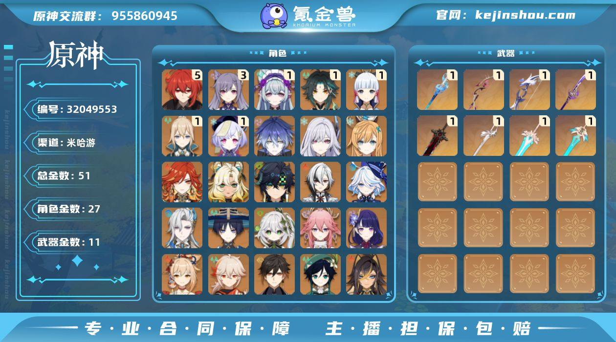 邮箱: 未绑定 总黄数: 51 冒险等级: 60 5命金色角色: 五命迪卢克 3命金色角色: 三命刻晴 1命金色角色: 一命神里绫华,一命七七,一命琴,一命魈,一命梦见月瑞希 0命金色角色: 温迪,枫原万叶,宵宫,钟离,莫娜,雷电将军,八重神子,提纳里,纳西妲,流浪者,迪希雅,那维莱特,芙宁娜,阿蕾奇诺,基尼奇,希诺宁,玛薇卡,爱可菲,丝柯克,菲林斯 拥有武器: 狼的末路,天空之傲,风鹰剑,天空之刃,薙草之稻光,若水,最初的大魔术,静水流涌之辉 1精武器: 狼的末路,天空之傲,风鹰剑,天空之刃,薙草之稻光,若水,最初的大魔术,静水流涌之辉
