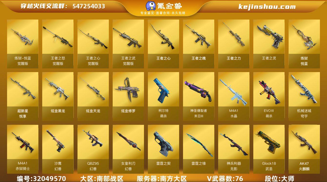 实名:可二次实名 段位:大师 VIP等级:VIP6 V武器数:76 王者武器数:11 CF点:4517 EVOⅢ-萌杀,柯尔特-萌杀,M4A1-水晶,神圣爆裂者-末日III,机械迷城-穹宇,M4A1-赤狱骑士,沙鹰-幻兽,QBZ95-幻兽,女皇利刃-幻兽,雷霆之契,雷霆之锋,无影-神兵利器,Glock18-武圣,AK47-火麒麟,AK47-无影,AK47-黑鲨,AK47-黑武士,AK47-机械迷城,M4A1-雷神,M4A1-黑骑士,M4A1-死神,M4A1-黑龙,M4A1-雷霆,M4A1-武圣,M4A1-千变,M4A1-猎神,M4A1-玫瑰精灵,白虎-电玩蓝兔,Barrett-毁灭,Barrett-极光,蔷薇大炮,AWM-天龙,AA-12-雷霆,AK12-天启,AN94-超新星,QBZ03-金色蔷薇,屠龙,龙啸,麒麟刺,擎天,M200-竞技荣光,柯尔特-竞技荣光,擎天-竞技荣光,Barrett-暗月传说,斩神刀-雷暴,AK47-B-战神,裁决,天神,破空枪刃 炼狱-悦蓝-觉醒版,王者之怒-觉醒版,王者之心-觉醒版,王者之武-觉醒版,王者之心,王者之魄,王者之力,王者之灵,炼狱-悦蓝,超新星-悦享 Barrett-毁灭音效卡 炫金黑龙,炫金天龙,炫金修罗 冰火魔兽,Mini沃特X,迷你白狐,COP-旗袍,猫猫手套