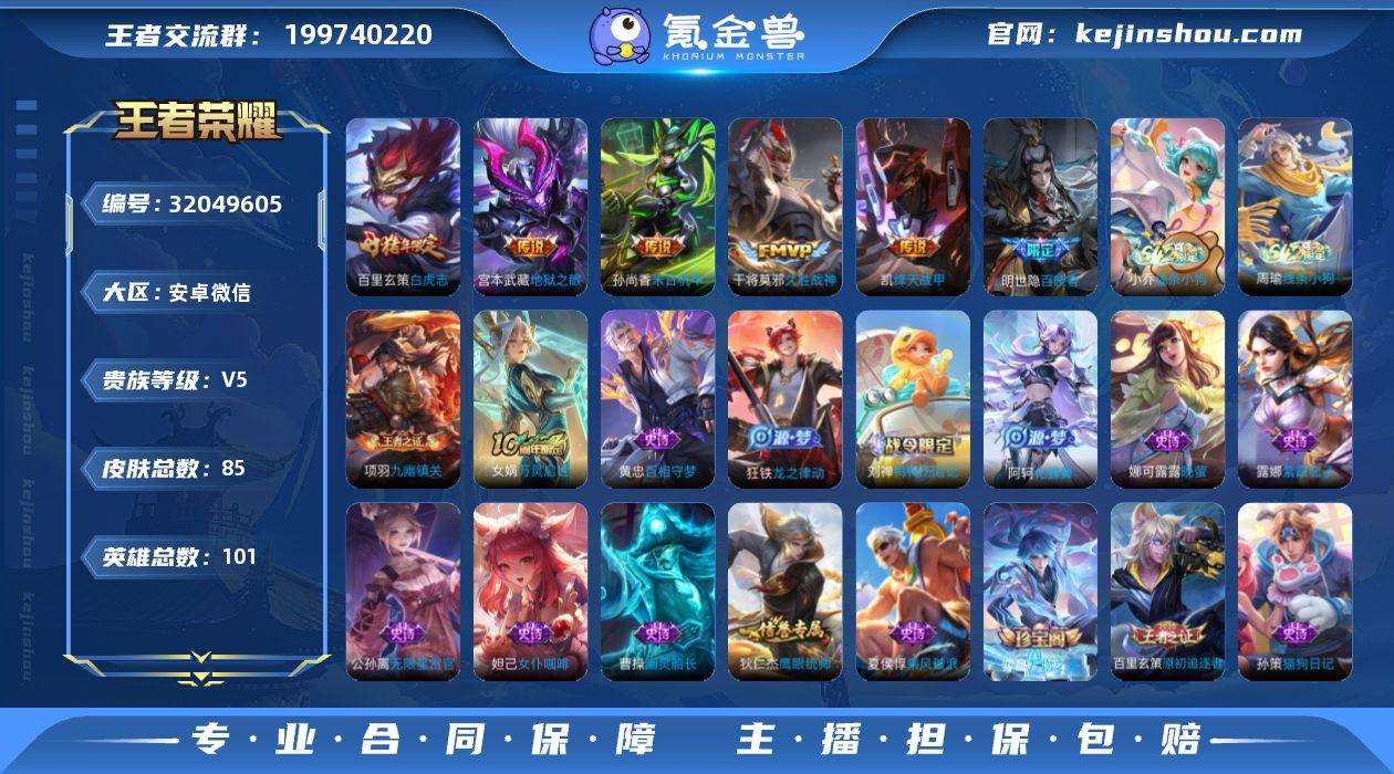 贵族等级:V5 典藏皮肤数:0 珍品无双皮肤数:0 无双皮肤数:0 珍品传说皮肤数:0 传说皮肤数:5 史诗皮肤数:26 皮肤数:85 英雄数:101 段位:荣耀王者