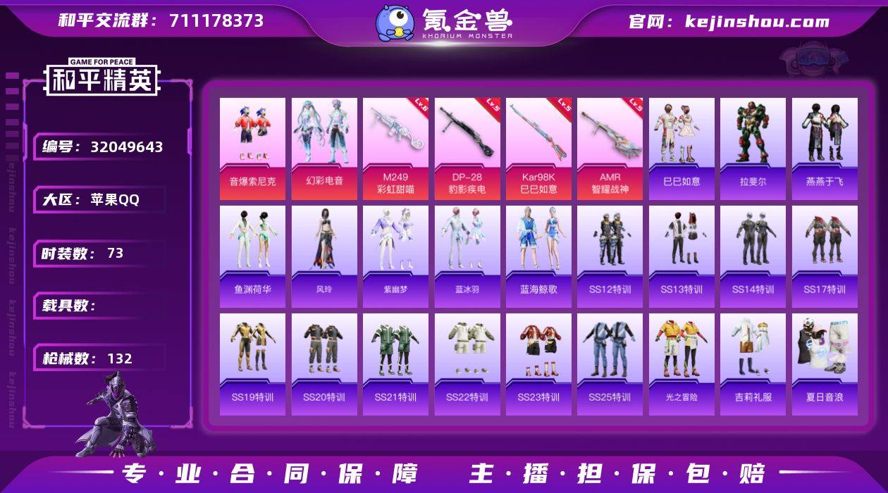 苹果 手Q-2粉装-4特效枪-0载具-0粉色飞行器-32893热力值-3王牌印记-73套装-132枪皮 【热门品类】:粉装-音爆索尼克 【粉色套装】:粉装-音爆索尼克,粉装-幻彩电音 【粉色枪皮等级】:Kar98K-巳巳如意(五级),AMR-智耀战神(五级),M249-彩虹甜喵(六级),DP-28-豹影疾电(五级) 【粉色枪皮】:Kar98K-巳巳如意,AMR-智耀战神,M249-彩虹甜喵,DP-28-豹影疾电 【粉色降落伞】:彩虹甜喵降落伞,旋转彩虹降落伞,月影灵韵降落伞,樱桃泡泡降落伞,智耀战神降落伞 【稀有套装】:套装-巳巳如意,角色-拉斐尔,套装-燕燕于飞,套装-鱼渊荷华,角色-风玲,套装-紫幽梦,套装-蓝冰羽,套装-蓝海鲸歌 【稀有枪皮】:AKM-夜灯,AKM-破晓战魂,AKM-萌趣颜团子,AKM-龙的传人,M16A4-幻世战舞者,M16A4-红色方程式,SCAR-L-炫彩节奏,SCAR-L-玉兔迎春,SCAR-L-红色方程式,SCAR-L-黄金龙骨,SCAR-L-小狗蛇点点,M416-糯团青竹,M416-红色方程式,M416-蓝色火焰,GROZA-黑色刀锋,GROZA-荧海星豚,AUG-天降萌叽,AUG-耀粉歌者,QBZ-原初圣火,QBZ-彩虹符号,M762-天降萌叽,M762-彩虹甜喵,M762-牛气冲天,AC-VAL-天降萌叽,AC-VAL-彩虹甜喵,蜜獾-天降萌叽,蜜獾-娇憨猪猪,UZI-啾咪啾咪,UZI-天降萌叽,UZI-娇憨猪猪,UZI-红色方程式,UMP45-夜灯,UMP45-蓝色火焰,UMP45-绒宝小鹅,Vector-彩虹符号,Vector-生命誓言,汤姆逊-天降萌叽,汤姆逊-奇异狩猎者,汤姆逊-炫彩节奏,汤姆逊-耀粉歌者,AKS-74U-鬼刀,P90-筑梦精灵,P90-巳巳如意,Kar98K-彩虹符号,Kar98K-红色方程式,M24-幻彩电音,SKS-炫彩节奏,Mini14-原初圣火,Mini14-炫彩节奏,Mini14-耀粉歌者,SLR-娇憨猪猪,MK20-H-莲影清波,SVD-冷漠罗丽,S686-彩虹符号,S686-红色方程式,S686-巳巳如意,S1897-炫彩节奏,S12K-破晓战魂,S12K-娇憨猪猪,S12K-幻世战舞...